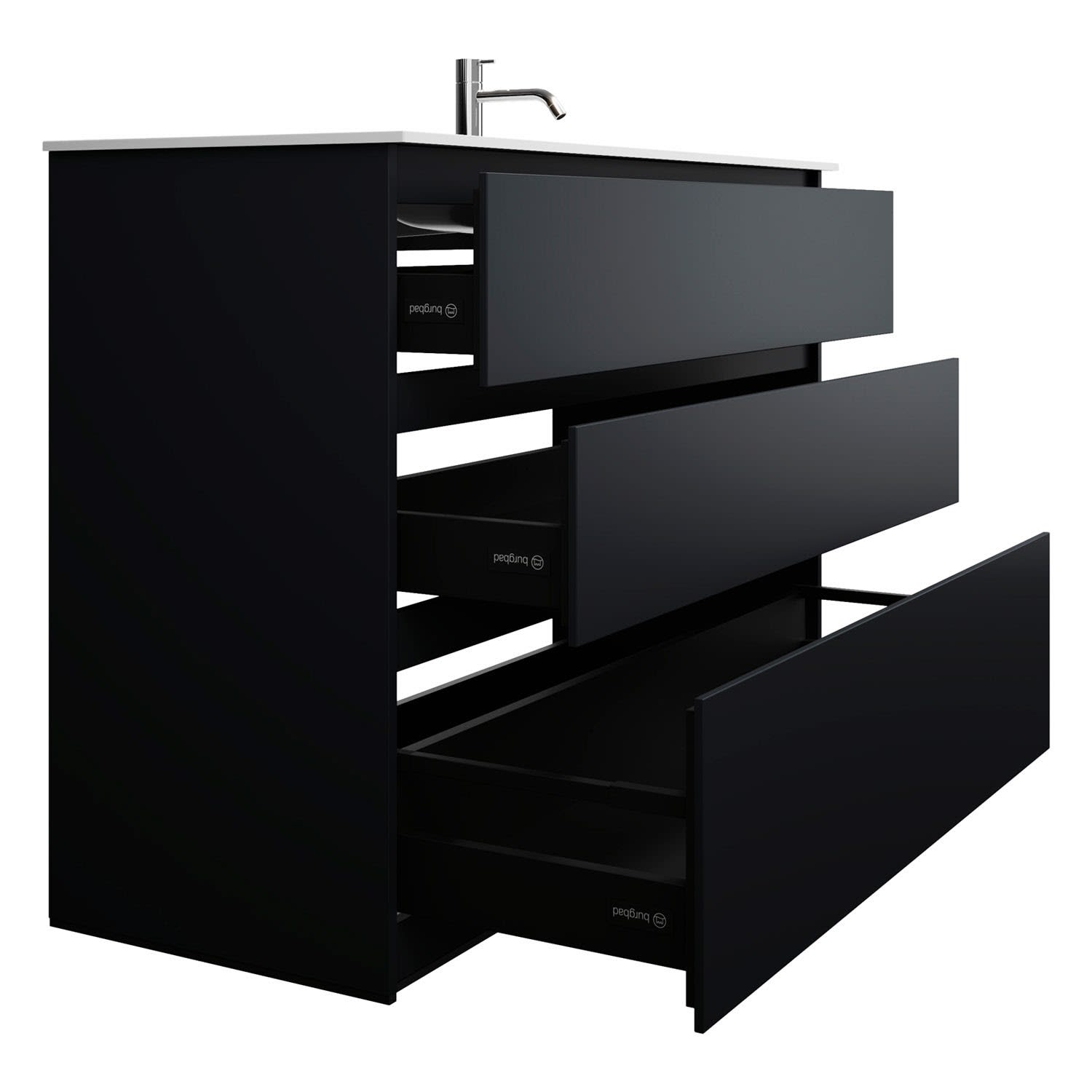 - Vollauszüge mit geräuscharmem Selbsteinzugsmechanismus und Anschlagdämpfung (Silent System)