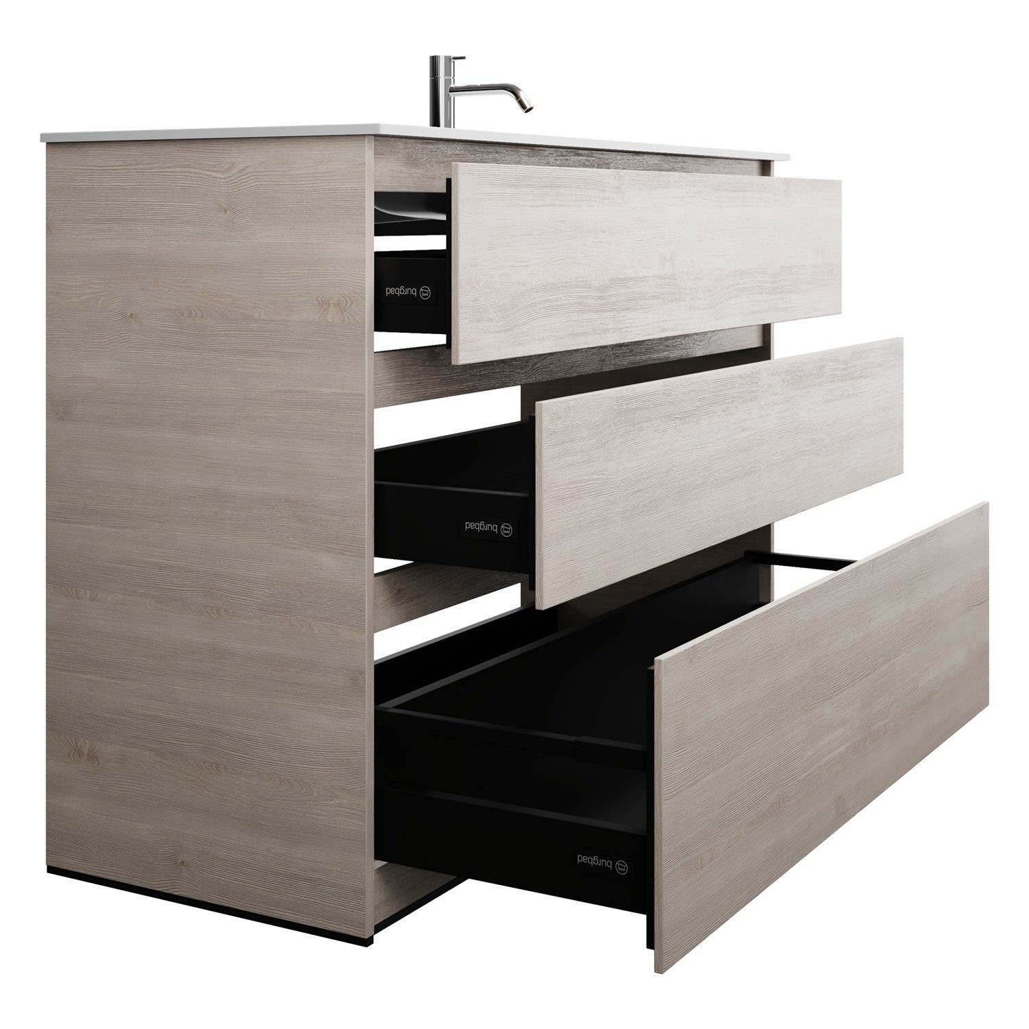 - Vollauszüge mit geräuscharmem Selbsteinzugsmechanismus und Anschlagdämpfung (Silent System)