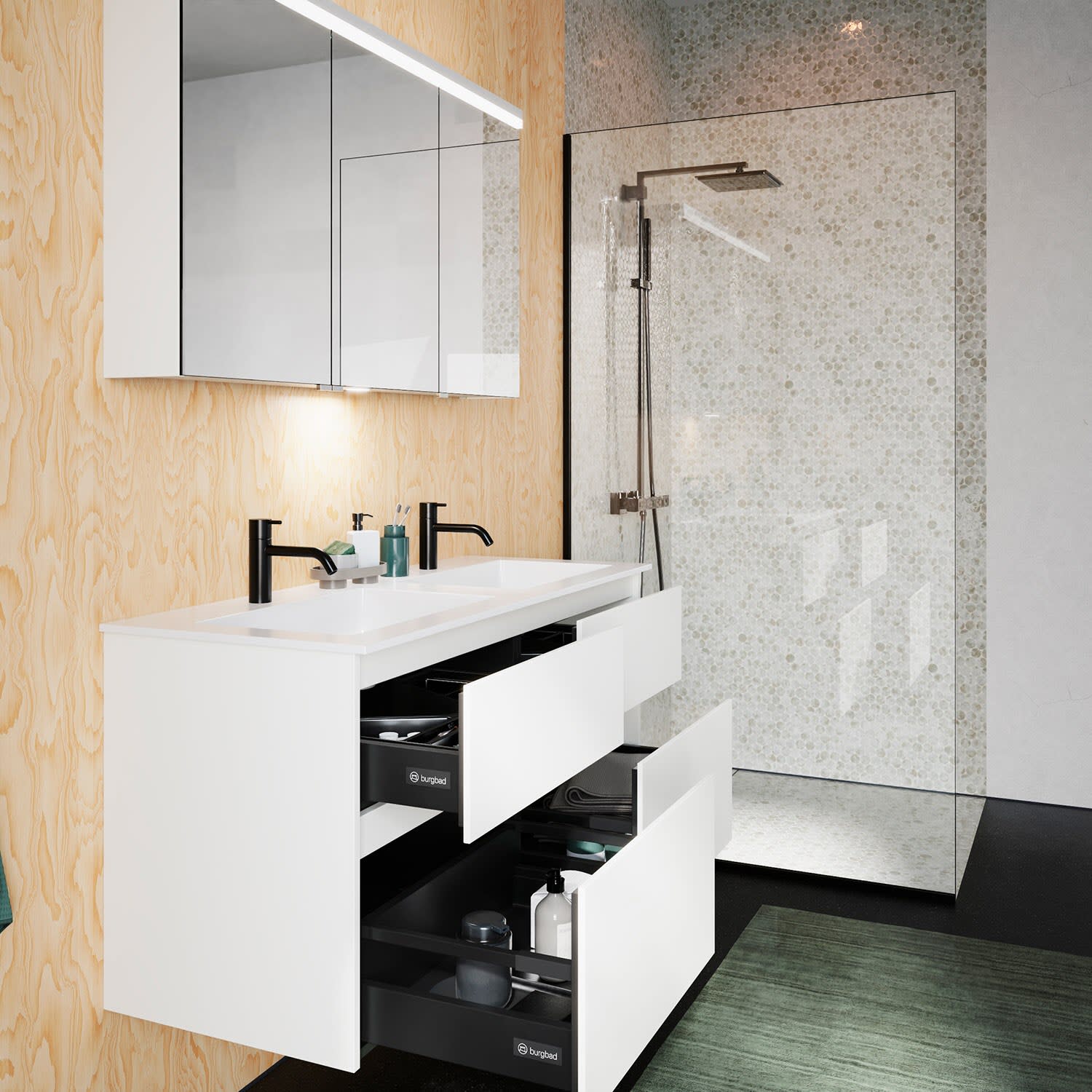 burgbad Lin20 Waschtischunterschrank mit Mineralguss-Doppelwaschtisch 122 cm, 4 Auszüge, links und rechts