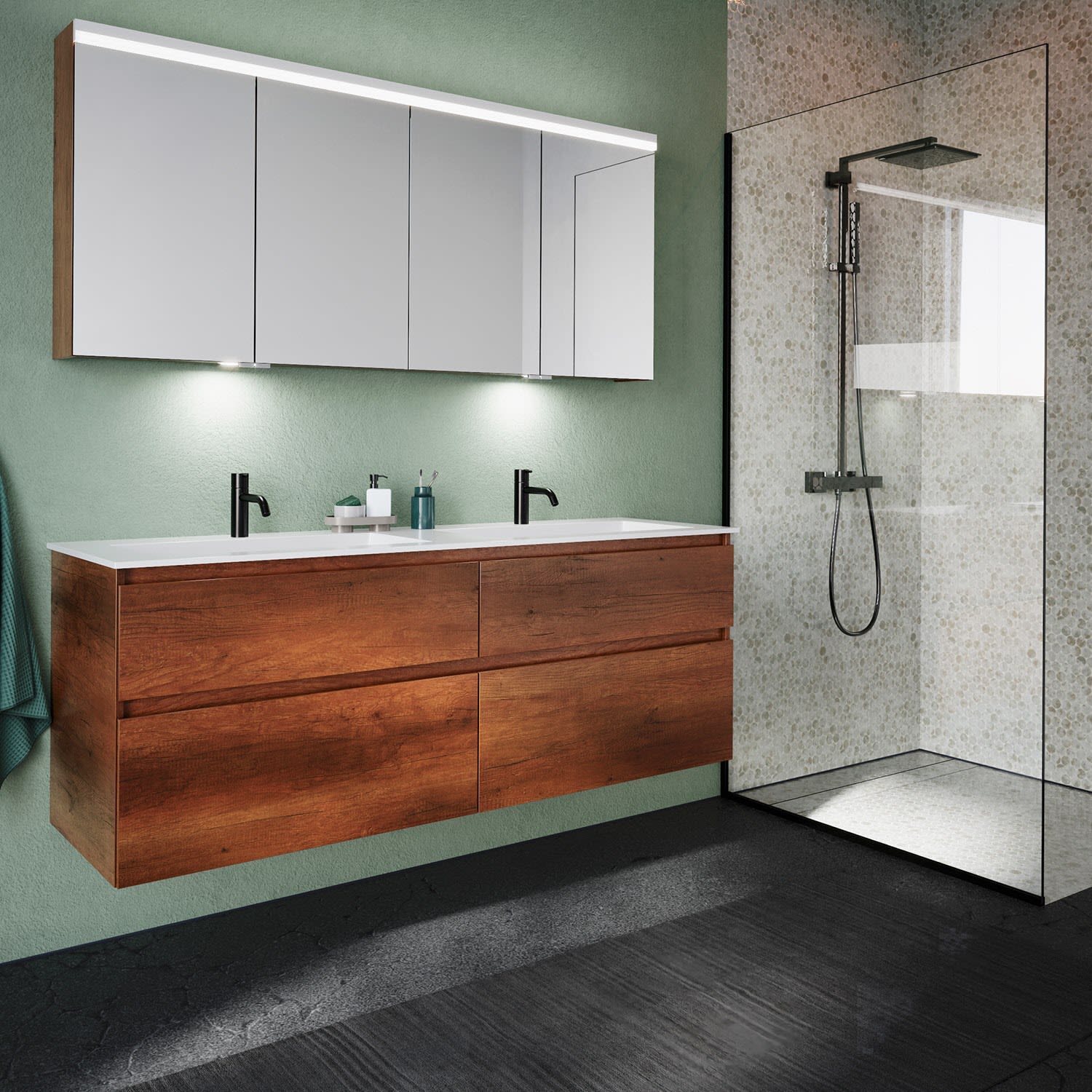 Puris b • essence Set mit Waschtischunterschrank links, Unterschrank und Waschtischplatte 161,2 cm, mit LED-Beleuchtung, Griff 342