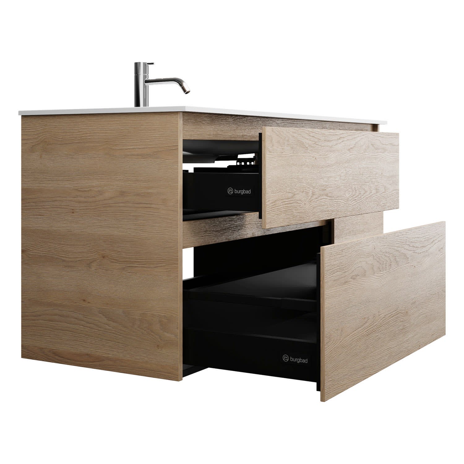 - Vollauszüge mit geräuscharmem Selbsteinzugsmechanismus und Anschlagdämpfung (Silent System)