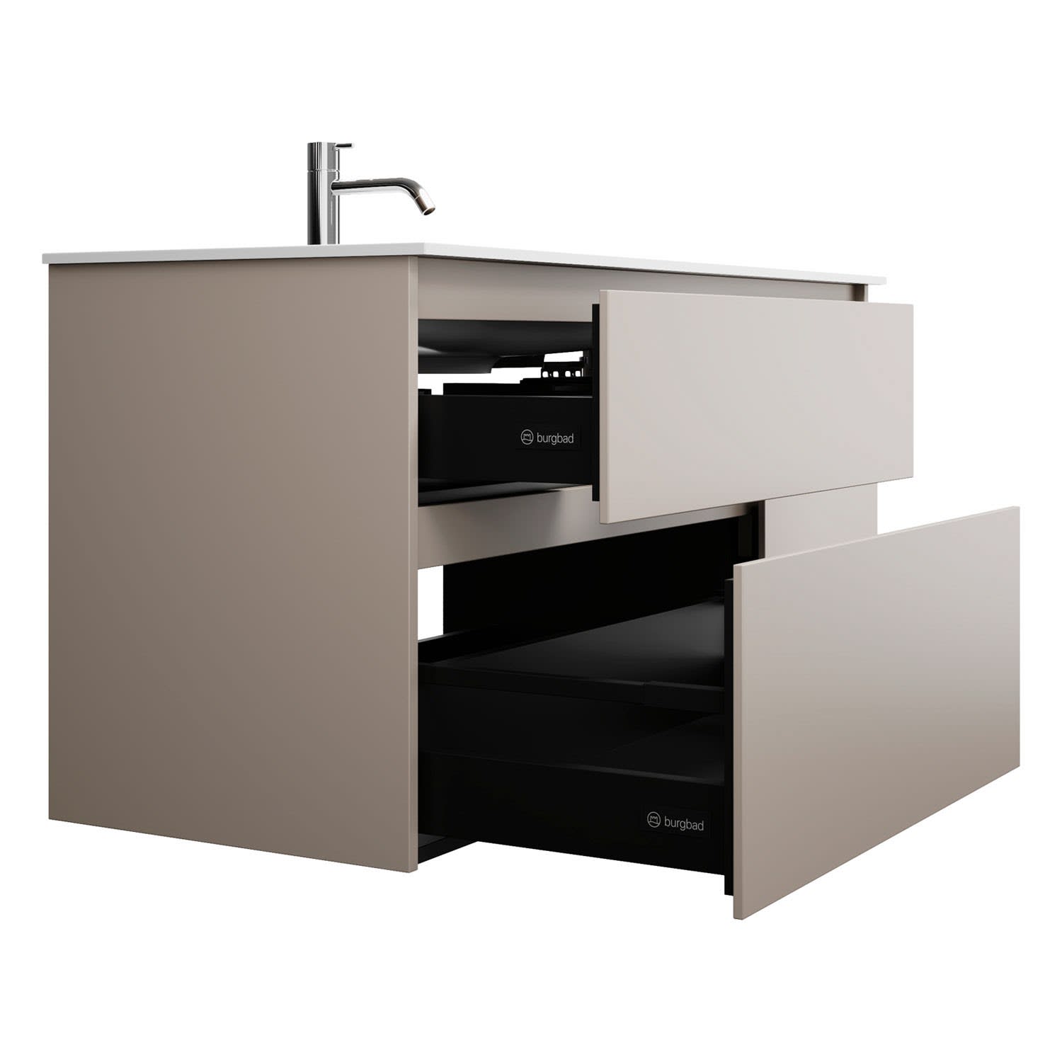 burgbad Lin20 Waschtischunterschrank mit Mineralguss-Waschtisch 122 cm, 4 Auszüge, links