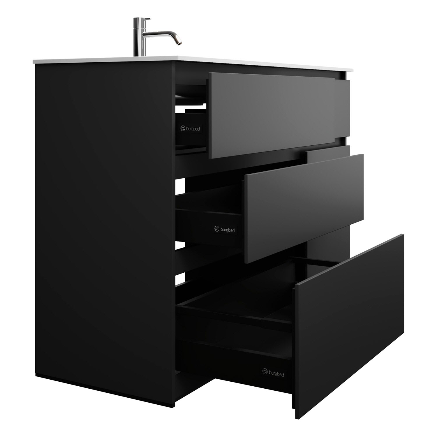 - Vollauszüge mit geräuscharmem Selbsteinzugsmechanismus und Anschlagdämpfung (Silent System)