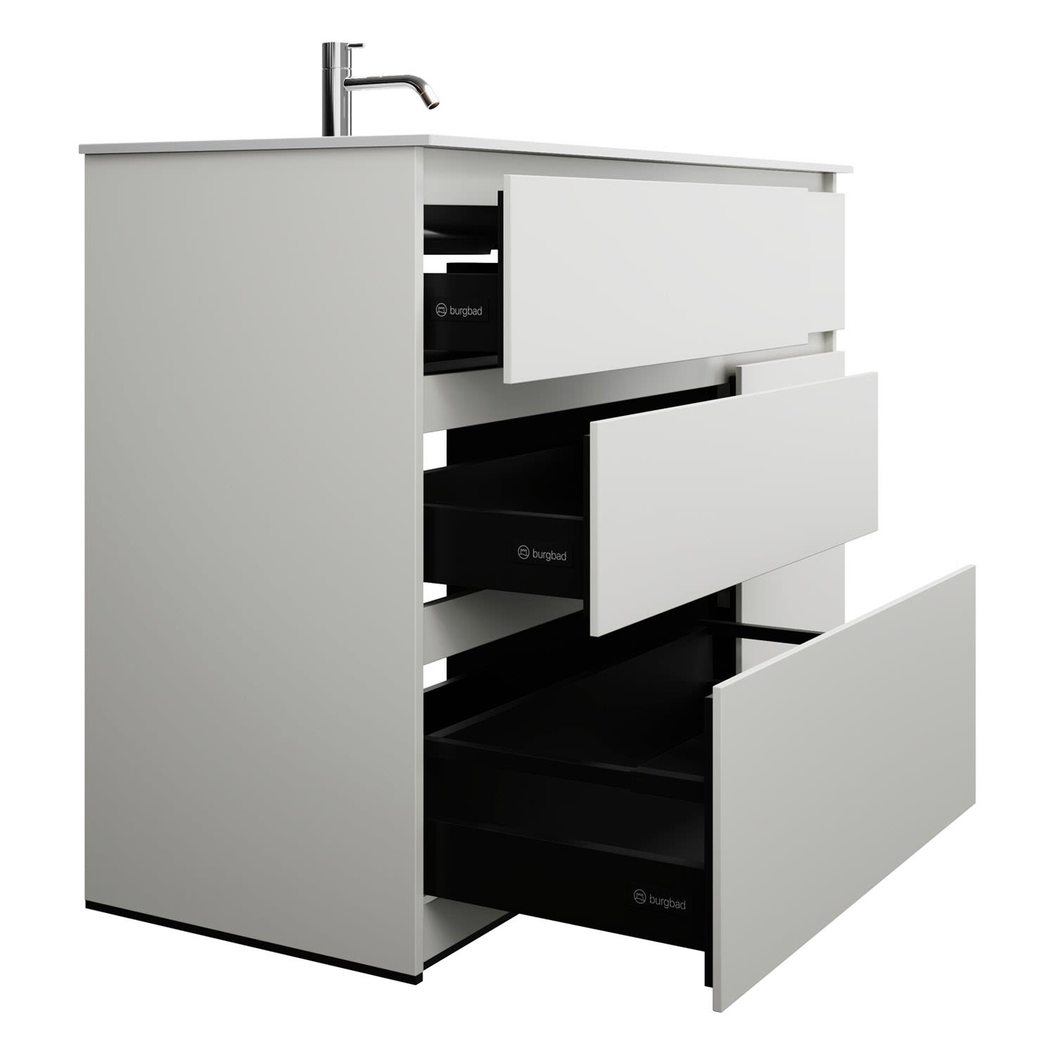 - Vollauszüge mit geräuscharmem Selbsteinzugsmechanismus und Anschlagdämpfung (Silent System)