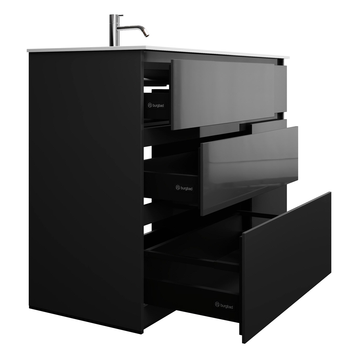 - Vollauszüge mit geräuscharmem Selbsteinzugsmechanismus und Anschlagdämpfung (Silent System)