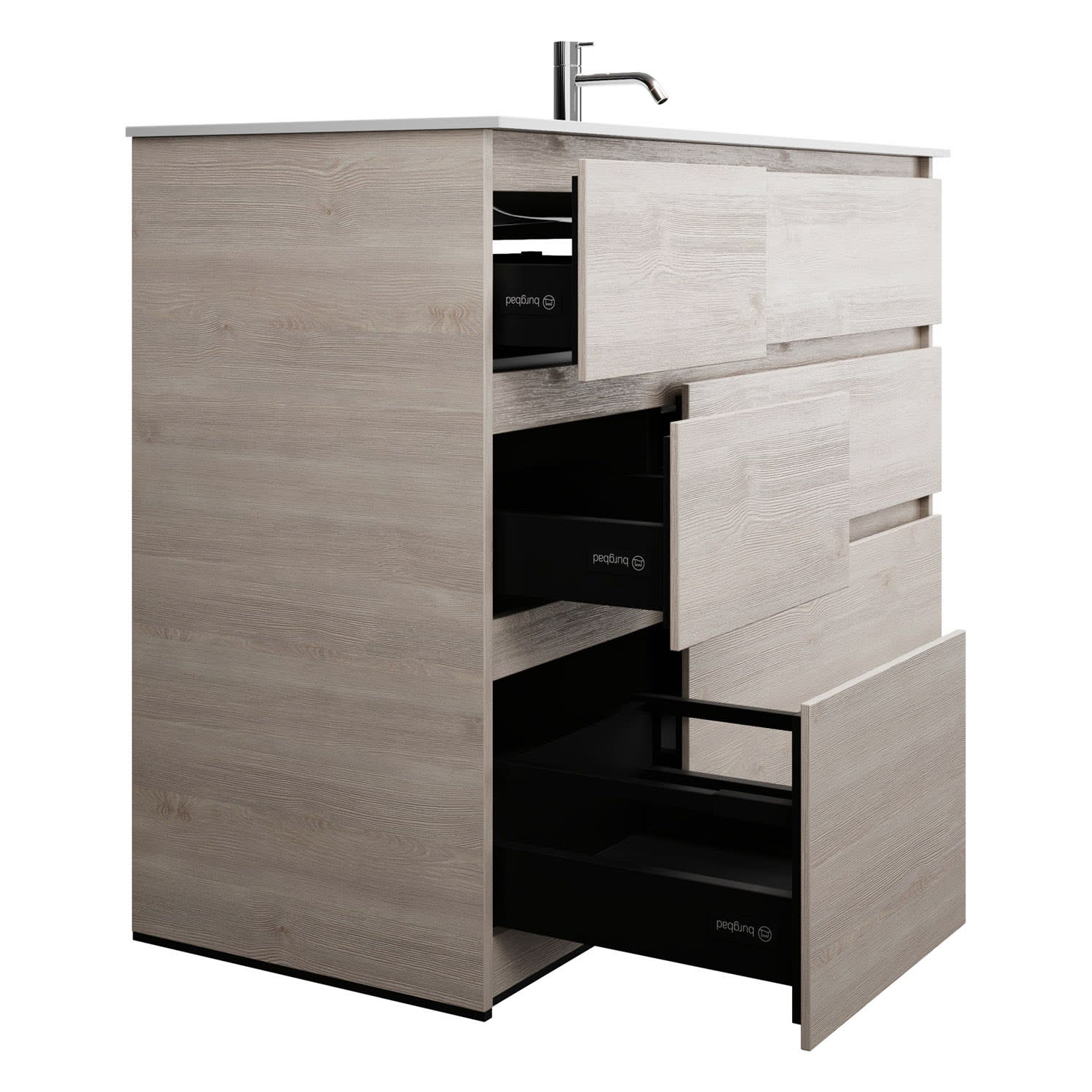 - Vollauszüge mit geräuscharmem Selbsteinzugsmechanismus und Anschlagdämpfung (Silent System)