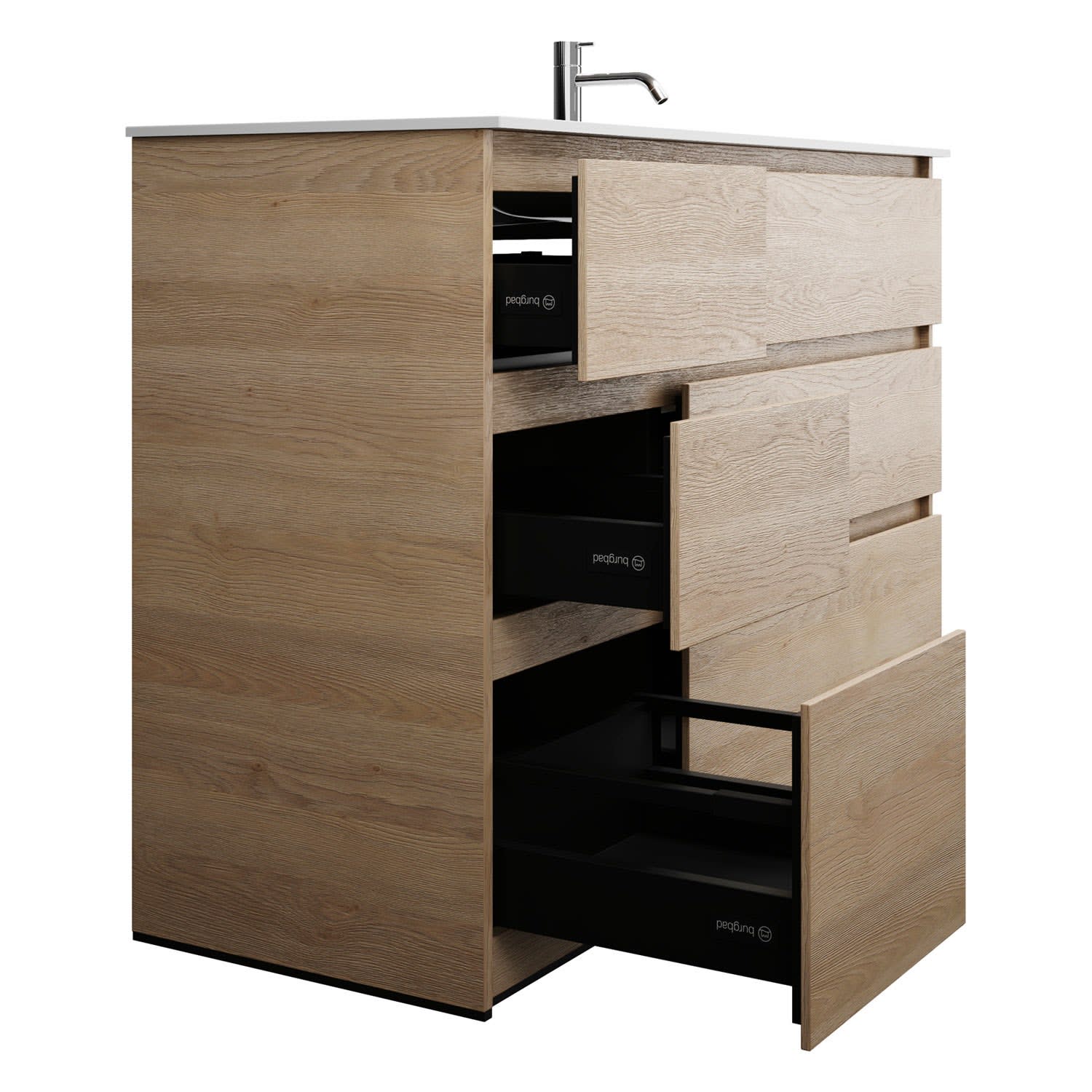 - Vollauszüge mit geräuscharmem Selbsteinzugsmechanismus und Anschlagdämpfung (Silent System)