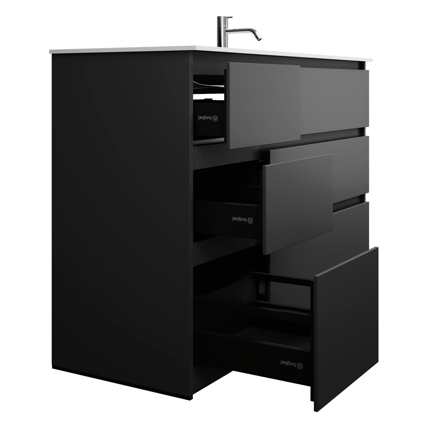 - Vollauszüge mit geräuscharmem Selbsteinzugsmechanismus und Anschlagdämpfung (Silent System)