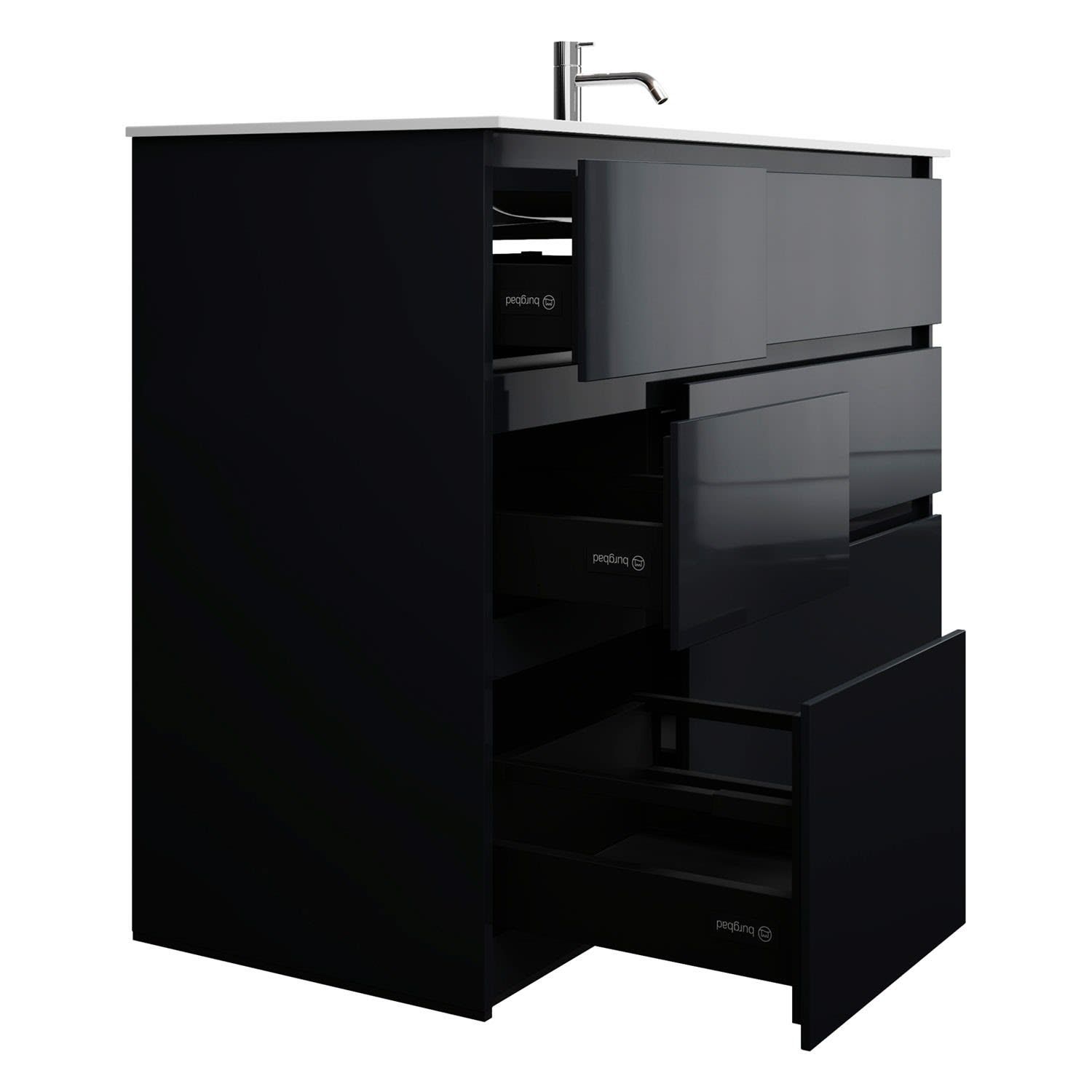- Vollauszüge mit geräuscharmem Selbsteinzugsmechanismus und Anschlagdämpfung (Silent System)