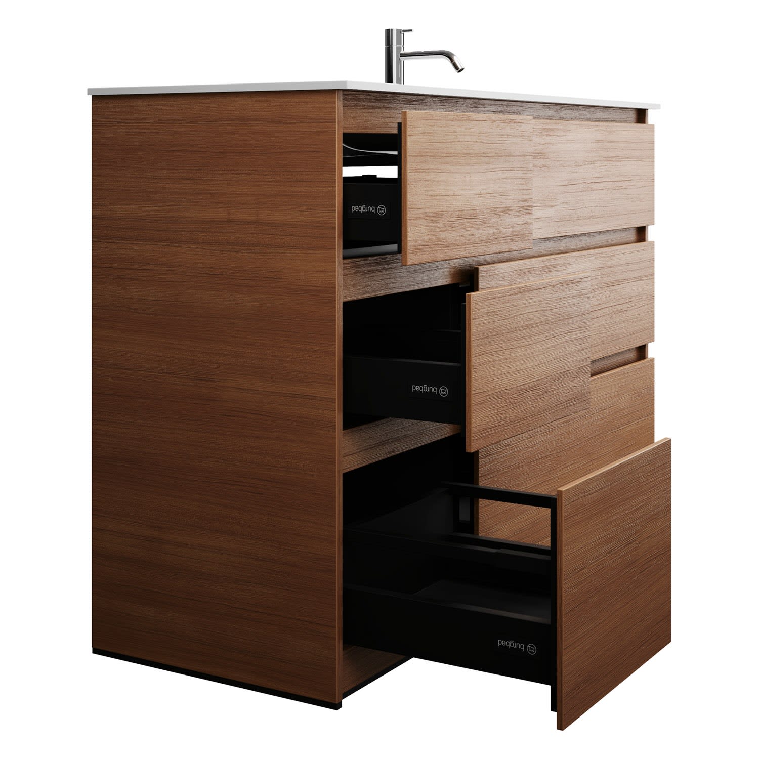 - Vollauszüge mit geräuscharmem Selbsteinzugsmechanismus und Anschlagdämpfung (Silent System)