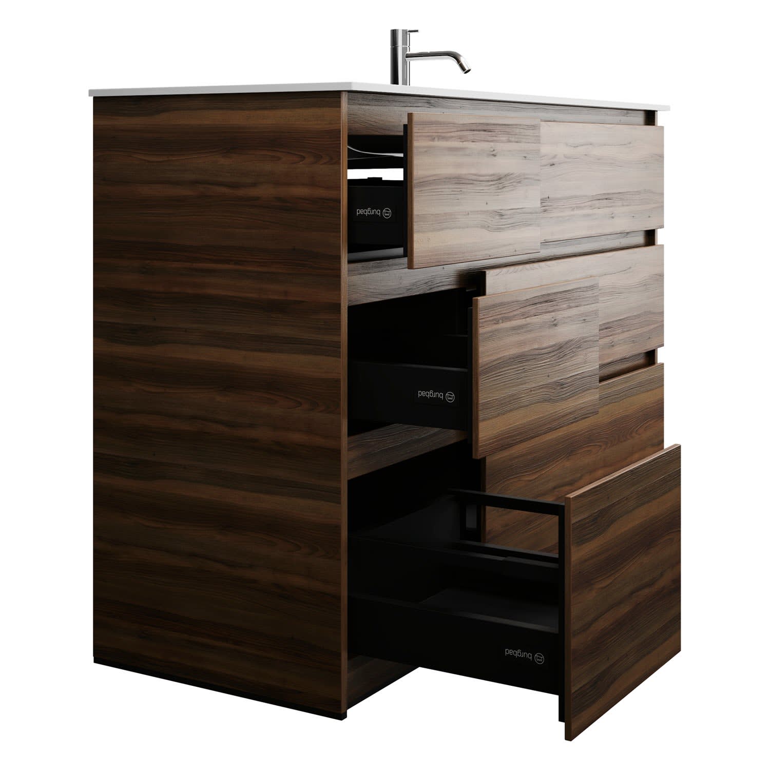 - 2 Auszüge oben H: 22 T: 35 cm, davon 1 Auszug mit Siphonausschnitten und Inneneinteilung
