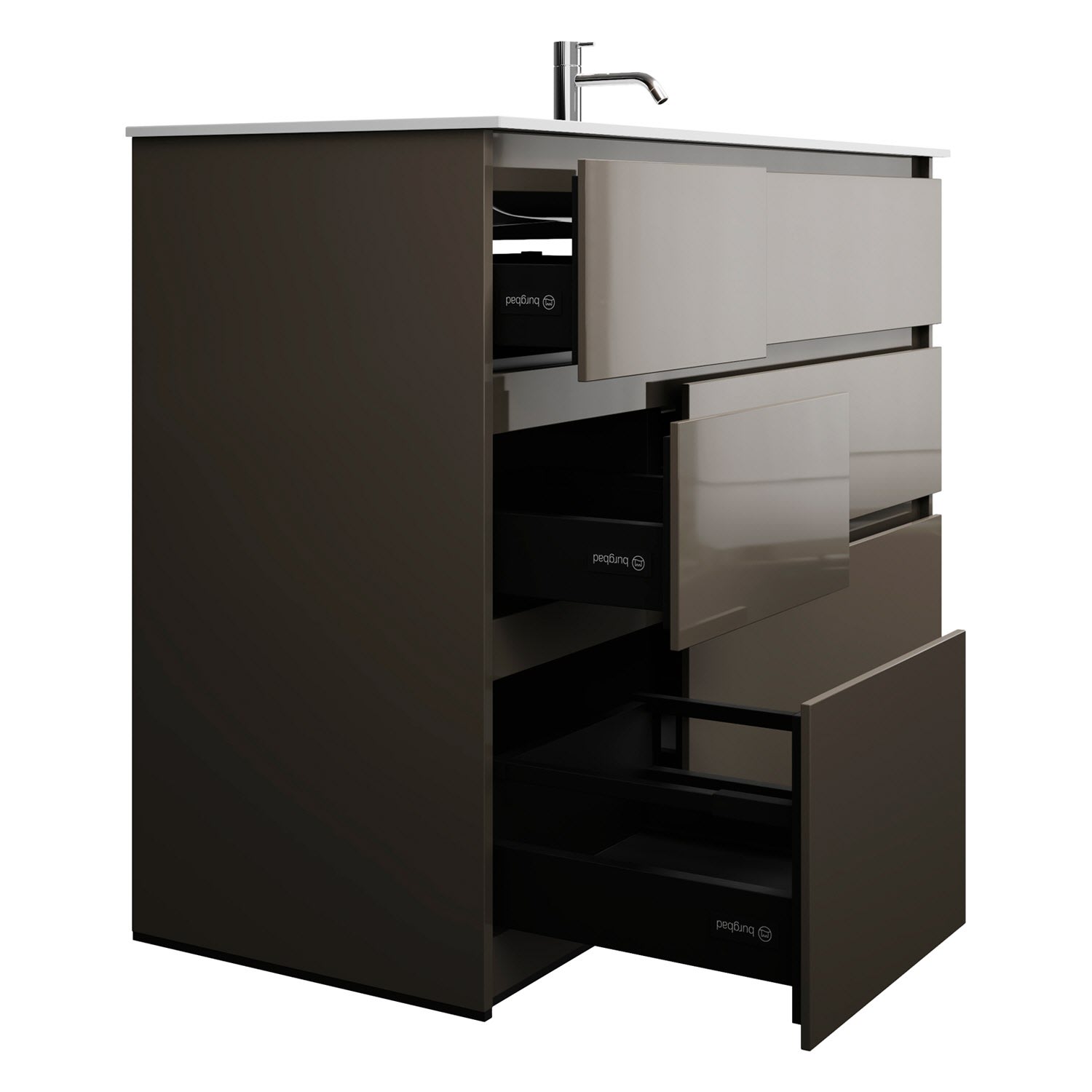 - Vollauszüge mit geräuscharmem Selbsteinzugsmechanismus und Anschlagdämpfung (Silent System)