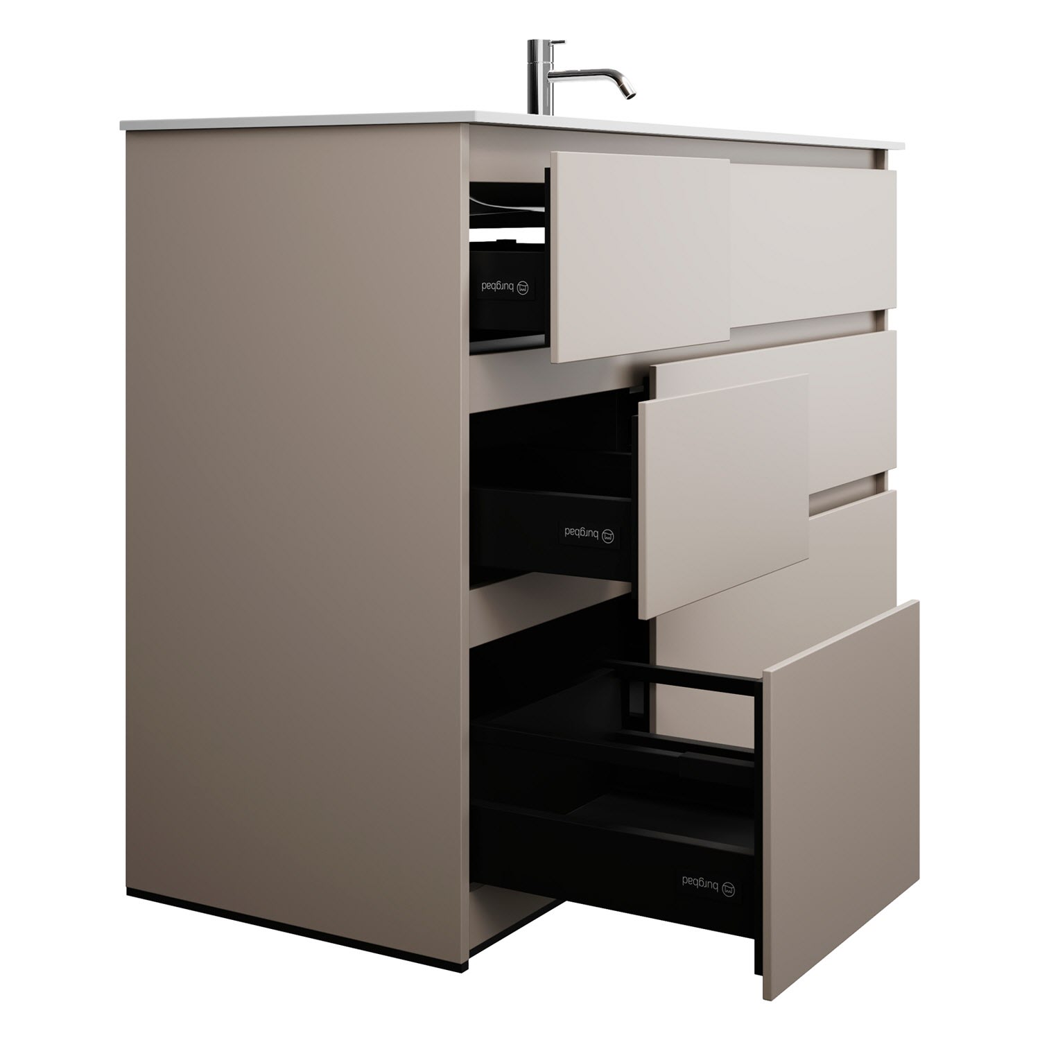 - Vollauszüge mit geräuscharmem Selbsteinzugsmechanismus und Anschlagdämpfung (Silent System)