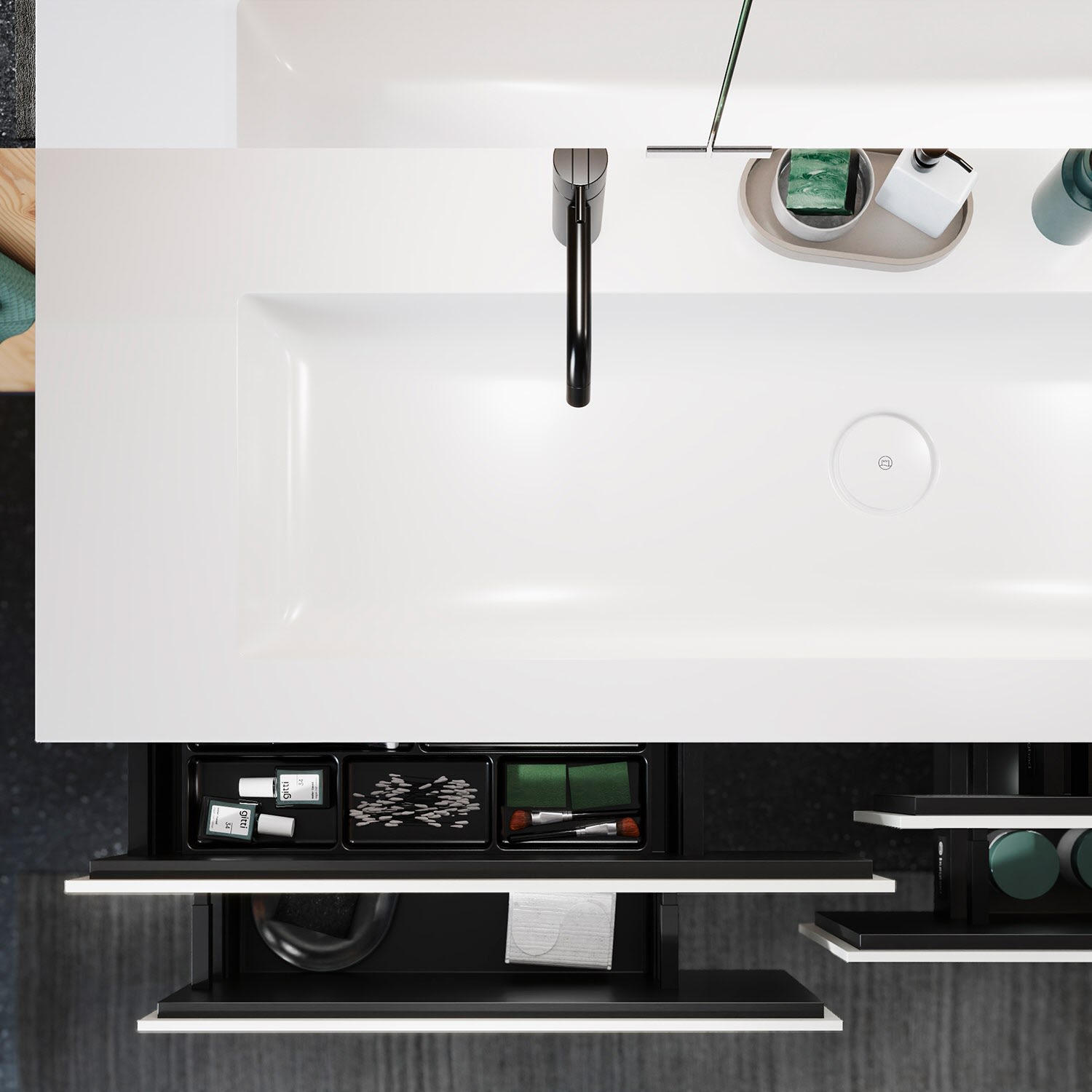 - Vollauszüge mit geräuscharmem Selbsteinzugsmechanismus und Anschlagdämpfung (Silent System)