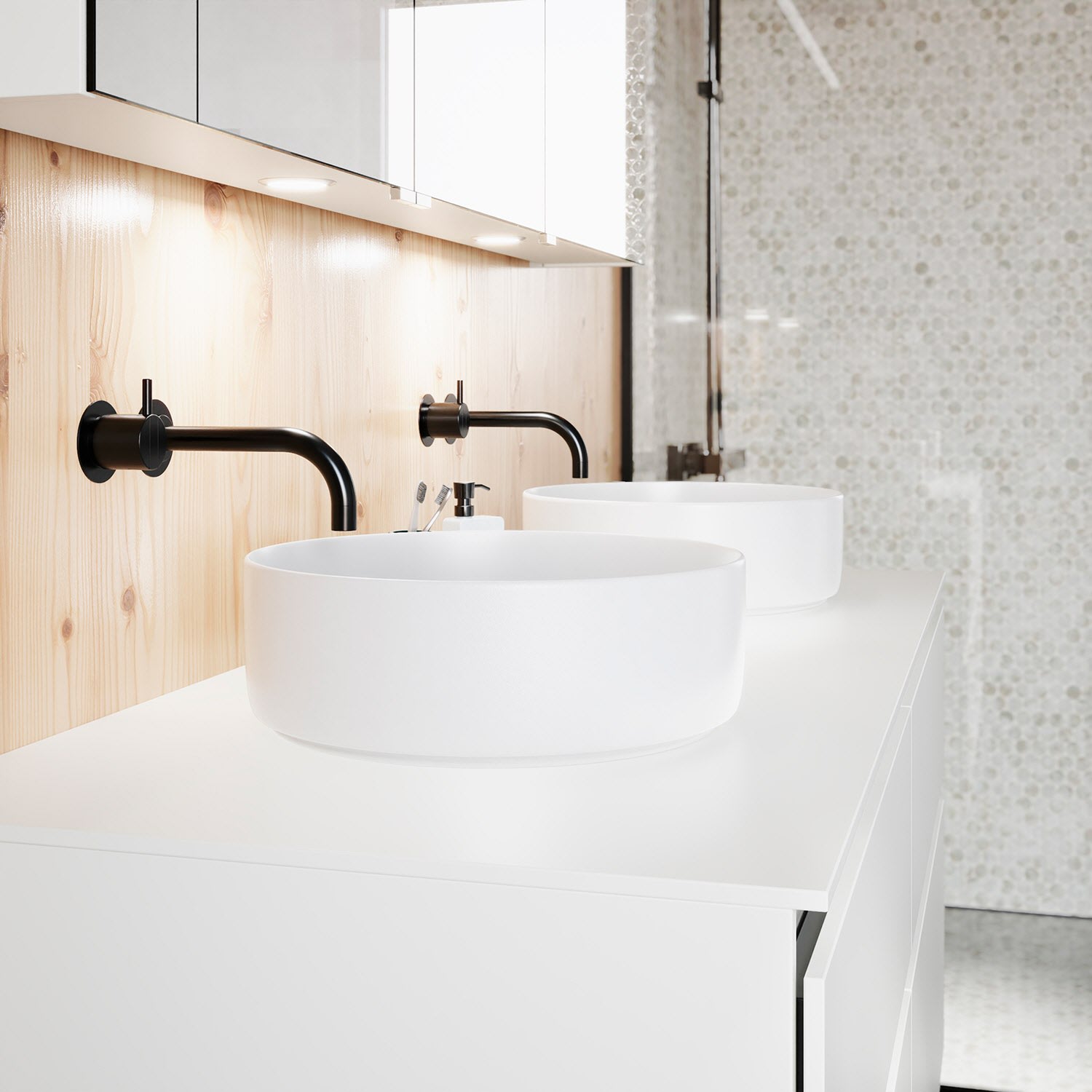 Die Waschtischplatte wird ohne Armaturbohrung geliefert. Armaturbohrungen müssen bauseits vorgenommen werden.