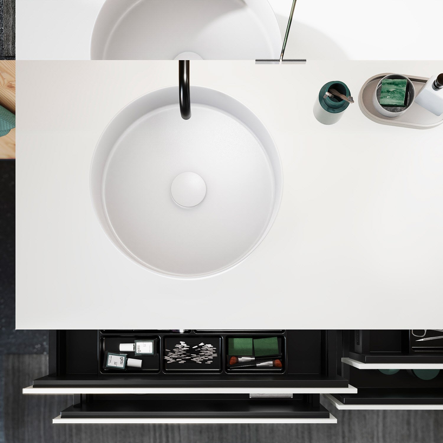 - 2 Auszüge oben H: 22 T: 35 cm, 1x mit Siphonausschnitt und Inneneinteilung