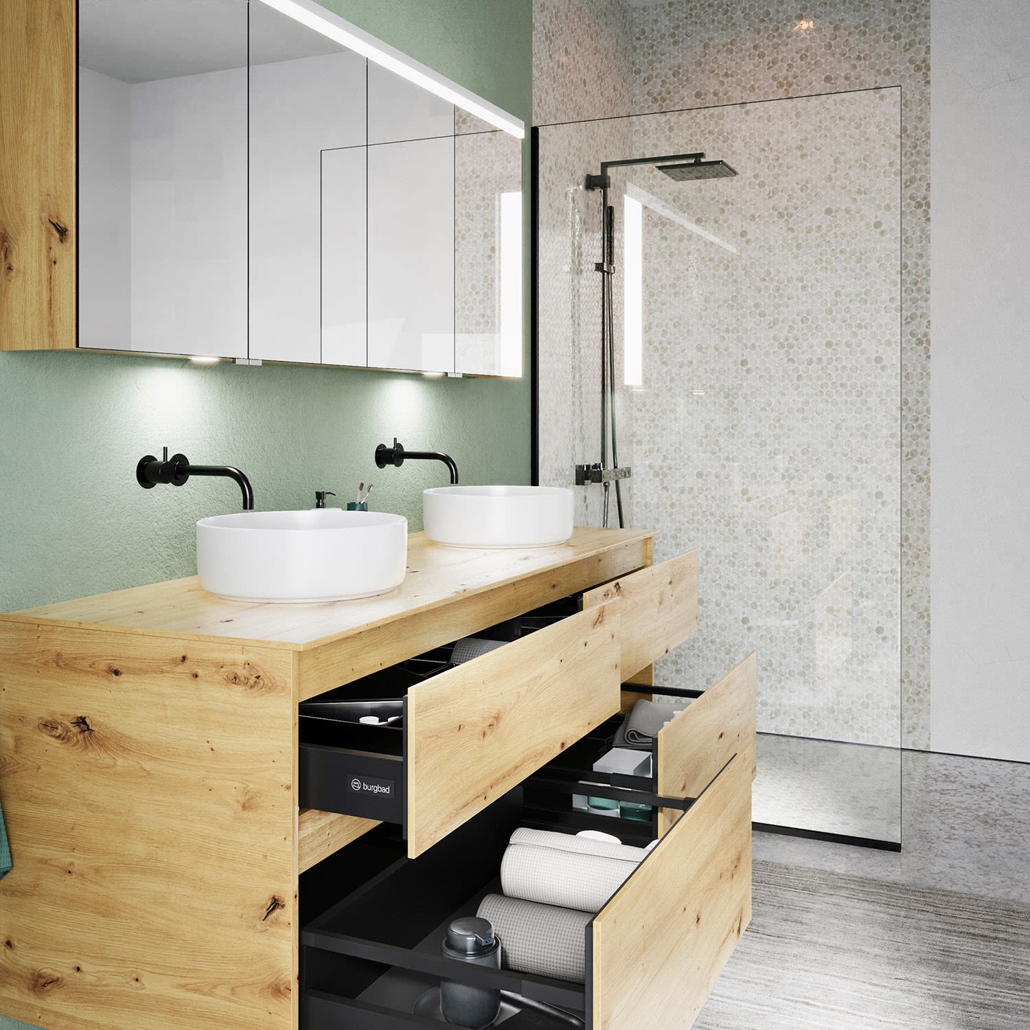 burgbad Lin20 Waschtischunterschrank mit Konsolenplatte 160 cm, 4 Auszüge, Beckenausschnitt links und rechts