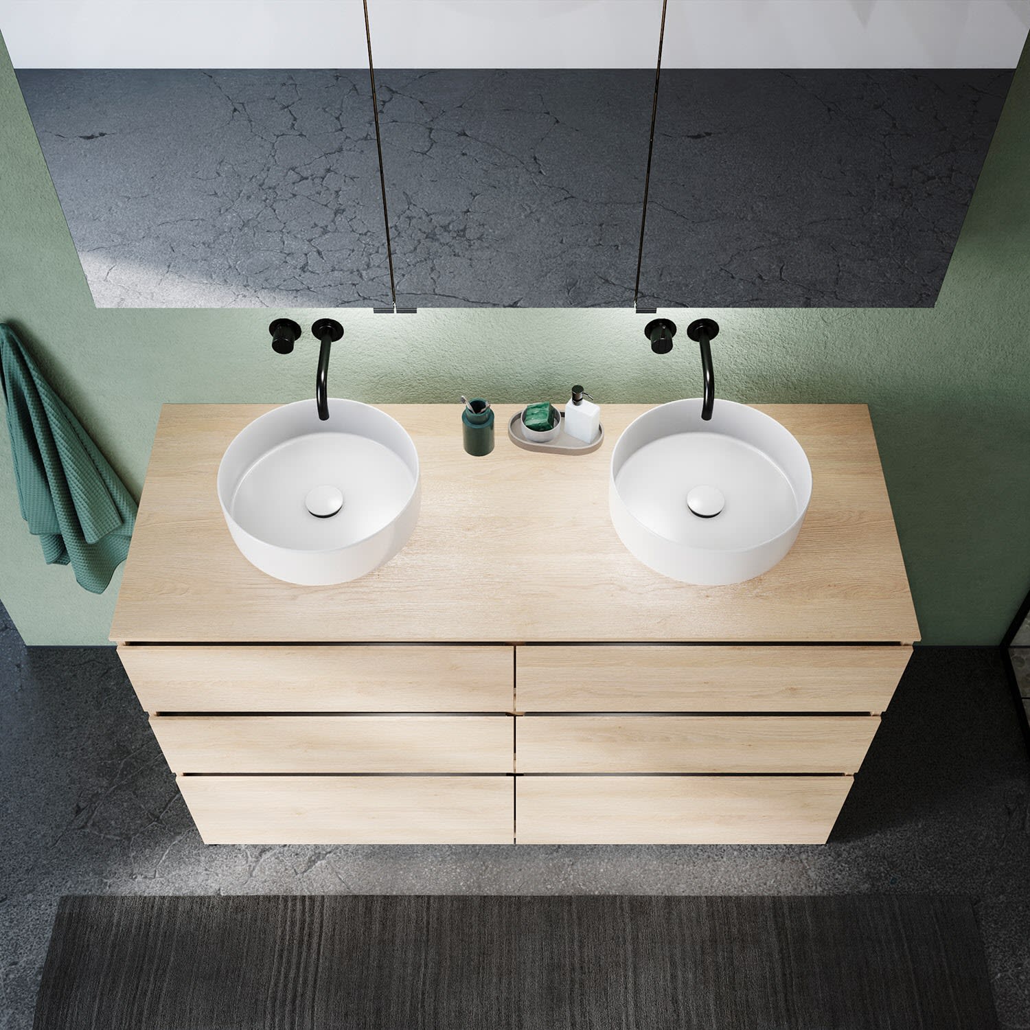 Die Waschtischplatte wird ohne Armaturbohrung geliefert. Armaturbohrungen müssen bauseits vorgenommen werden.