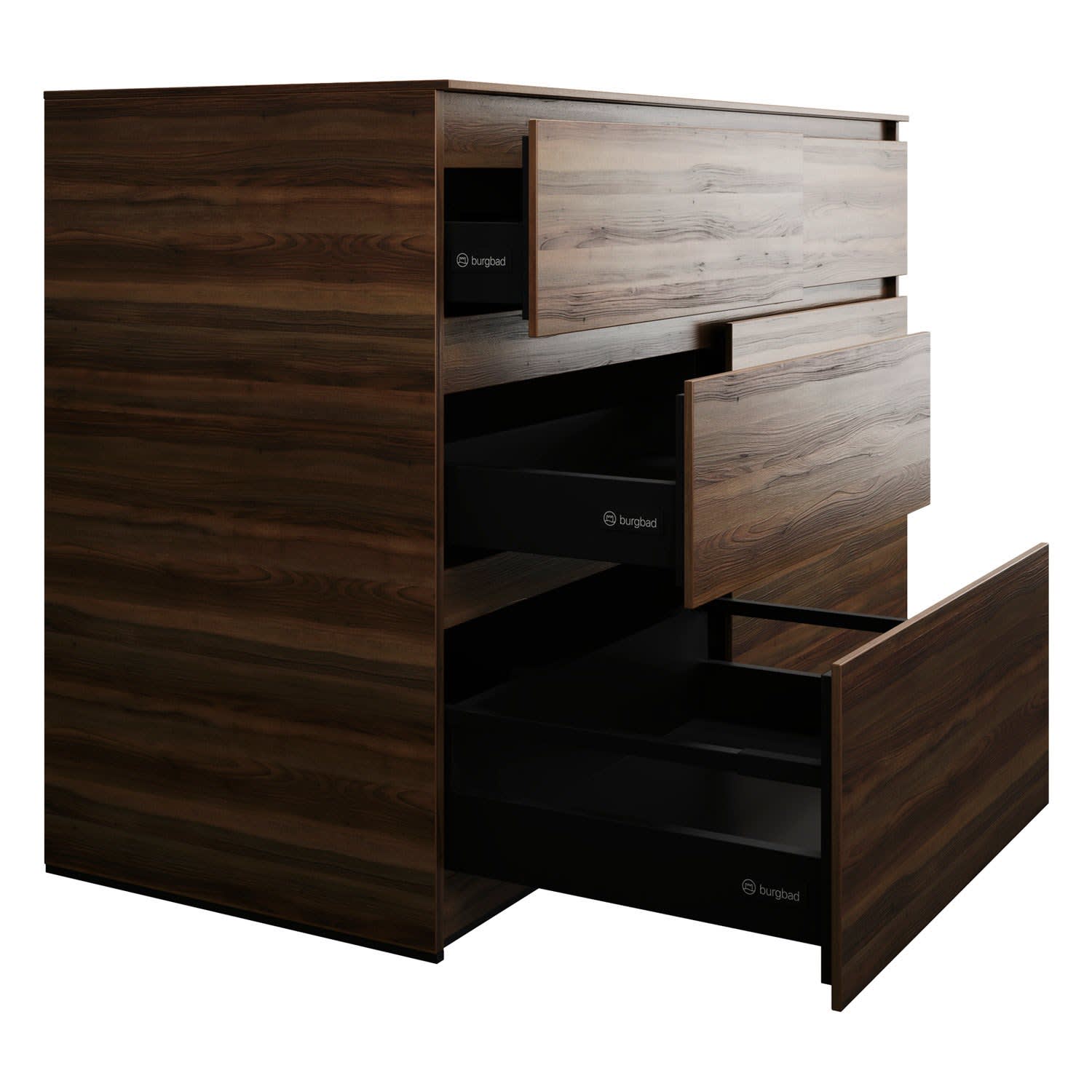 - 2 Auszüge oben H: 22 T: 35 cm, 1x mit Siphonausschnitt und Inneneinteilung