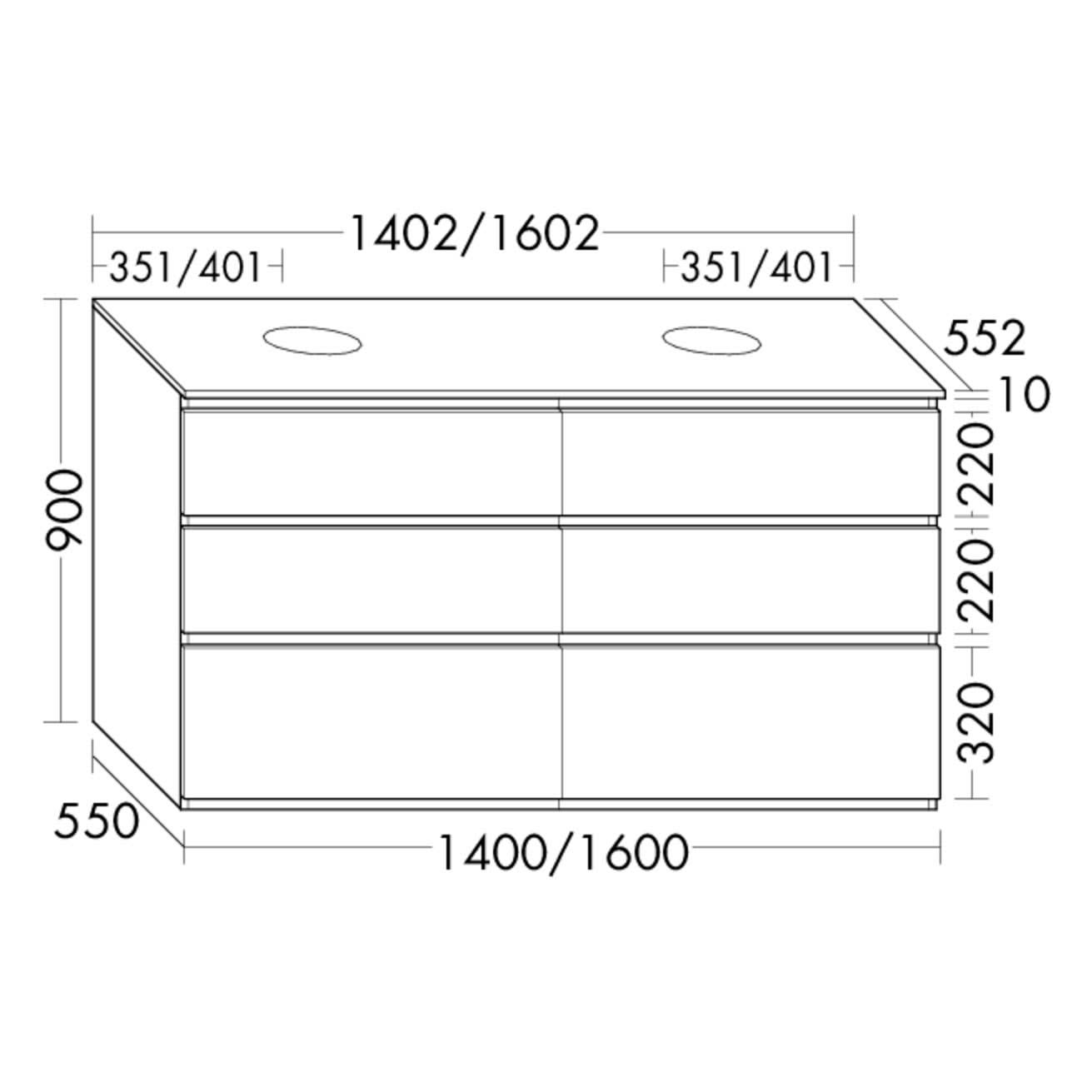 - Position Beckenausschnitt in der Tiefe: mittig bei Becken ohne Wandbefestigung oder wandbündig bei Becken mit Wandbefestigung (Bitte bei Bestellung den gewünschten Waschtisch mit angebeben.)
