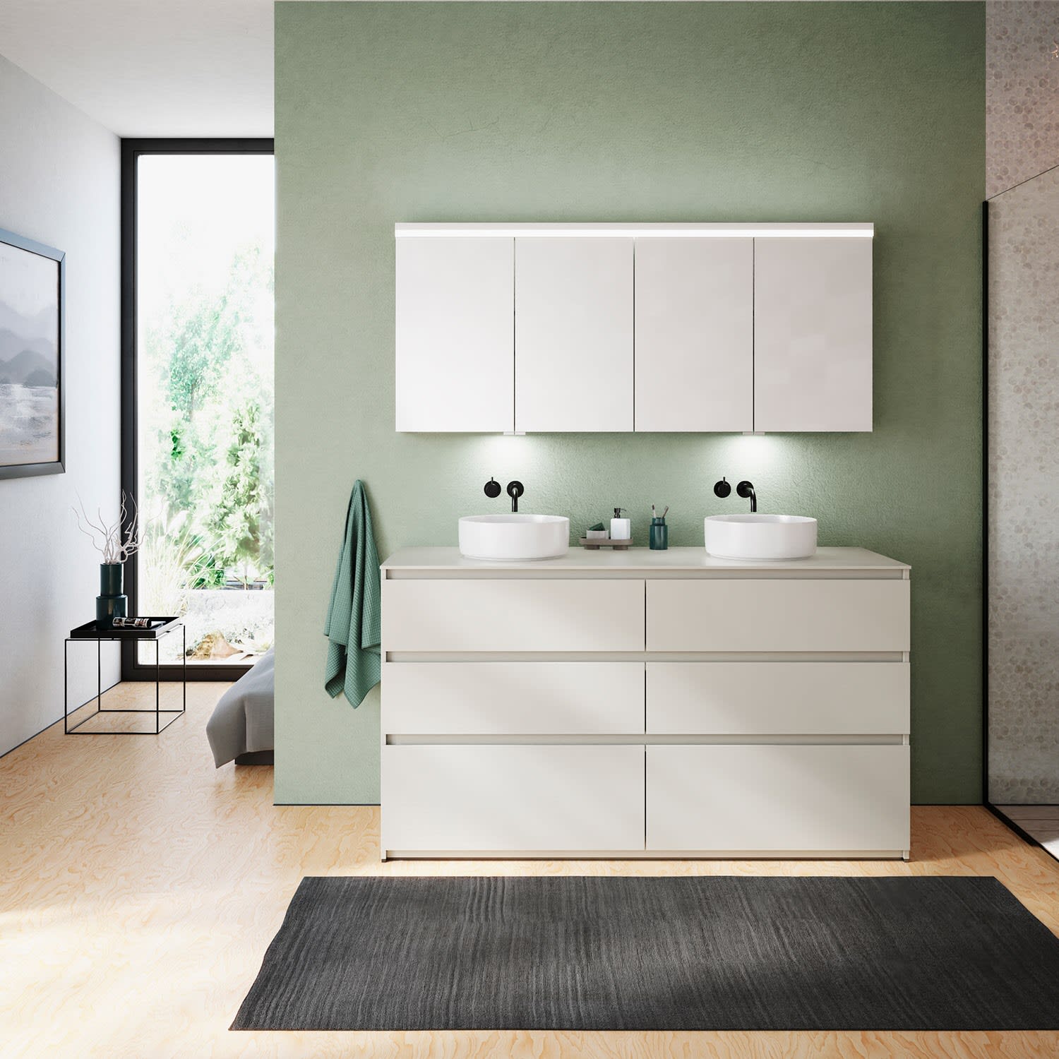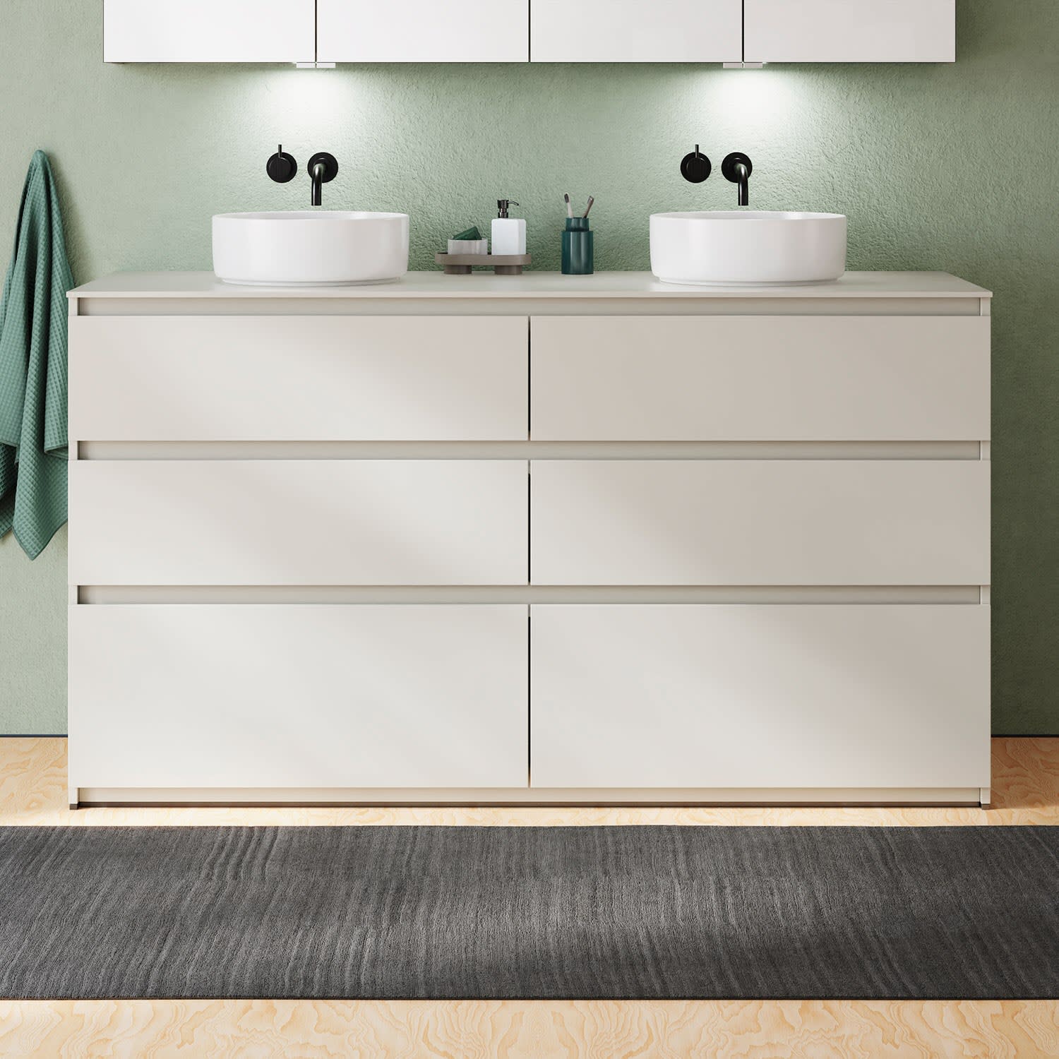 burgbad Lin20 Waschtischunterschrank mit Konsolenplatte 160 cm, 6 Auszüge, Beckenausschnitt links und rechts