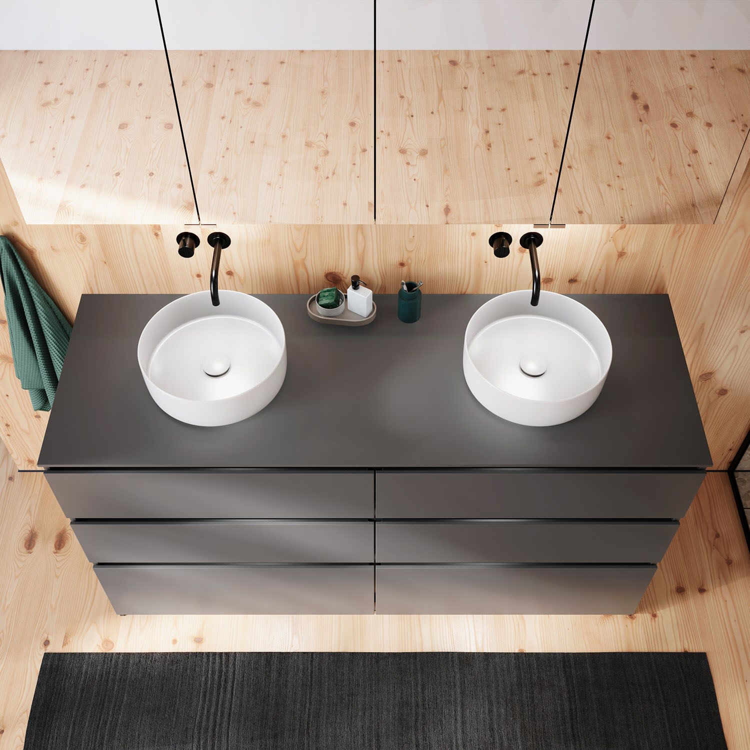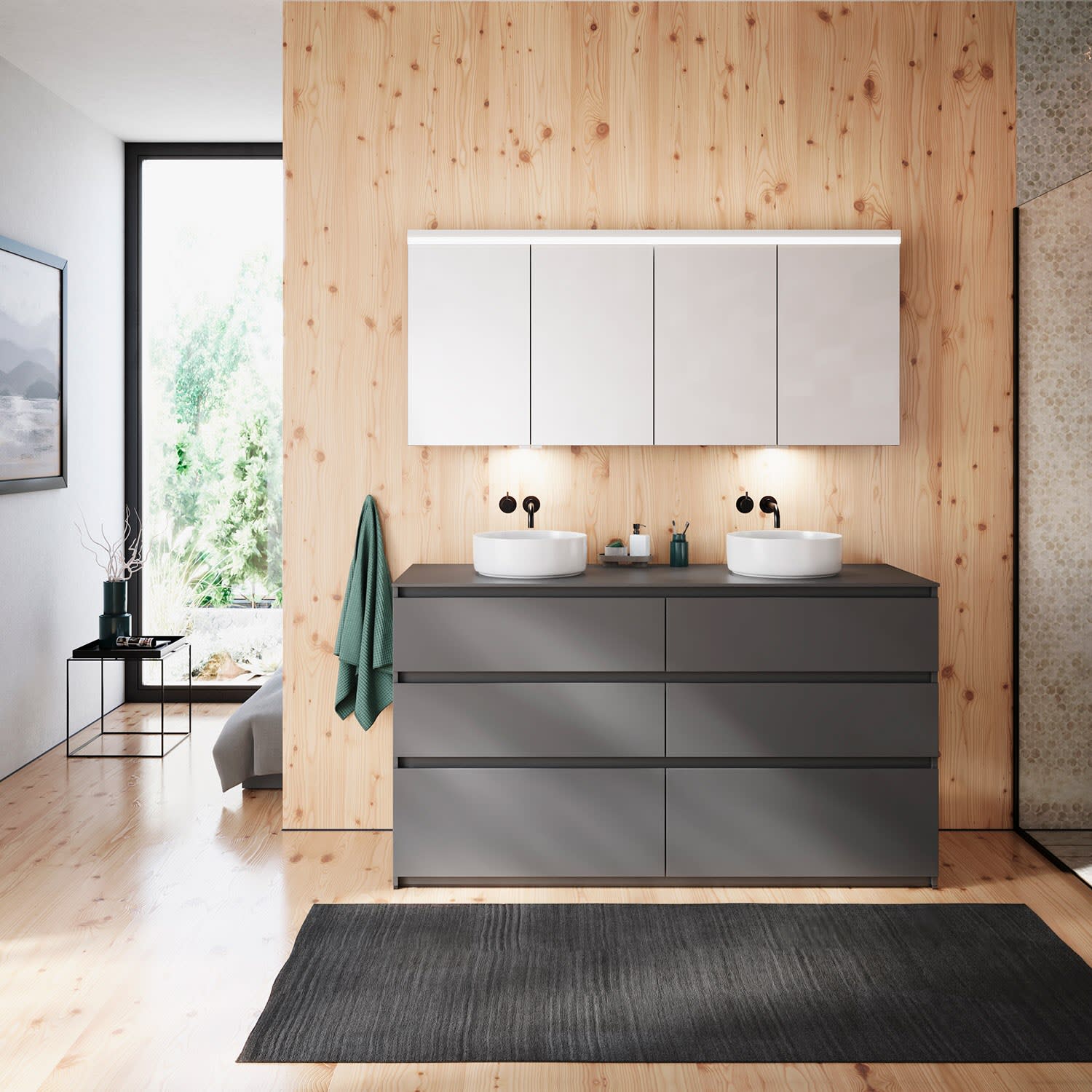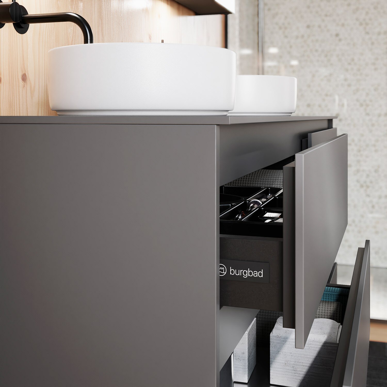 burgbad Lin20 Waschtischunterschrank mit Konsolenplatte 160 cm, 6 Auszüge, Beckenausschnitt links und rechts