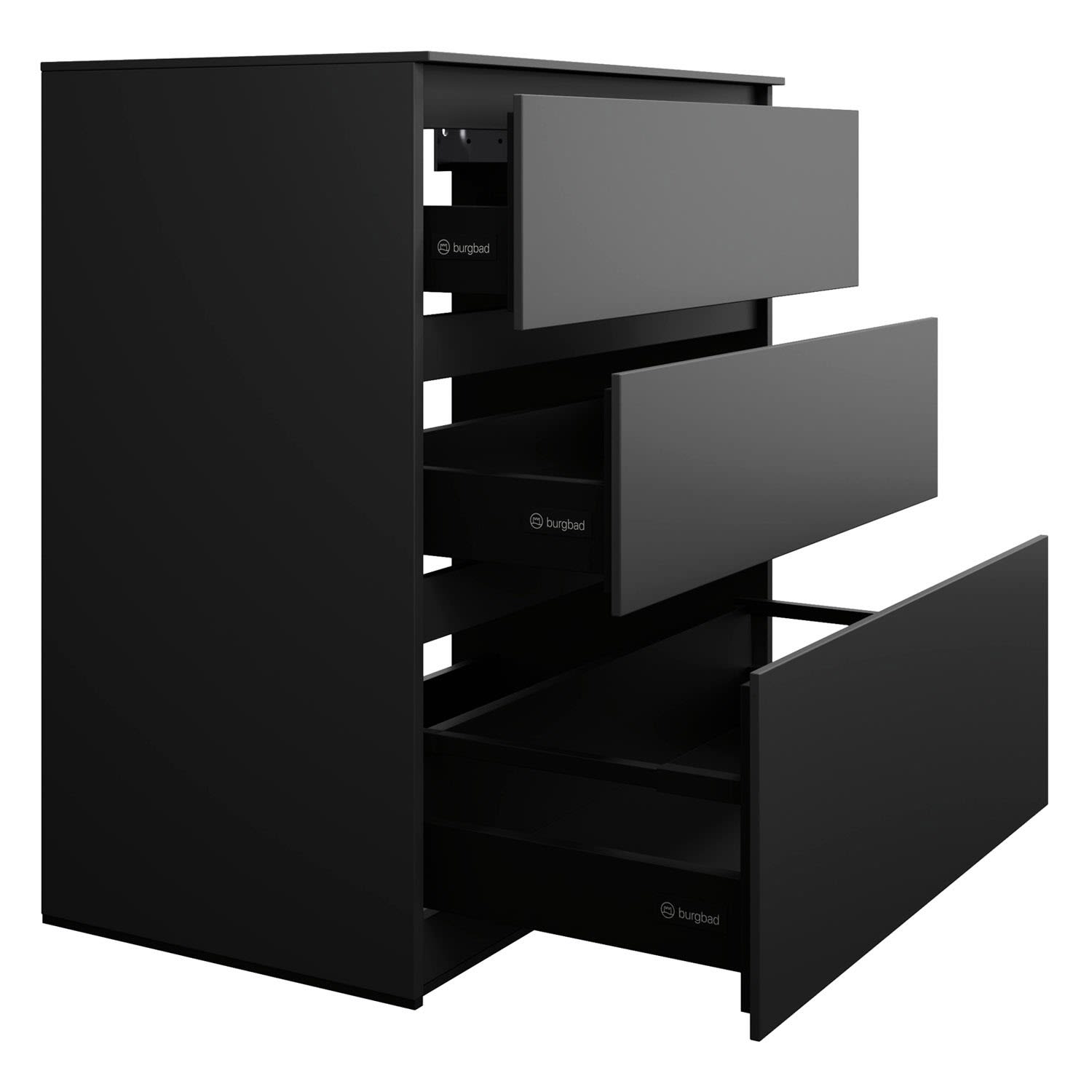 - Vollauszug mit geräuscharmem Selbsteinzugsmechanismus inklusive Anschlagdämpfung (Silent System)