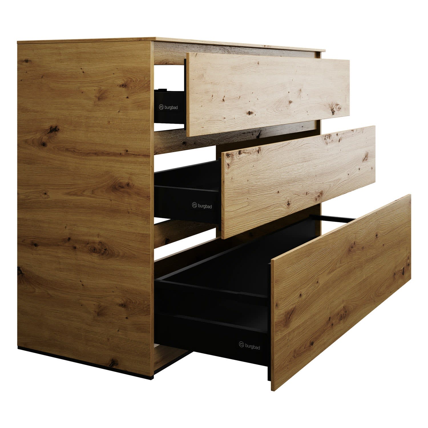 - Vollauszug mit geräuscharmem Selbsteinzugsmechanismus inklusive Anschlagdämpfung (Silent System)