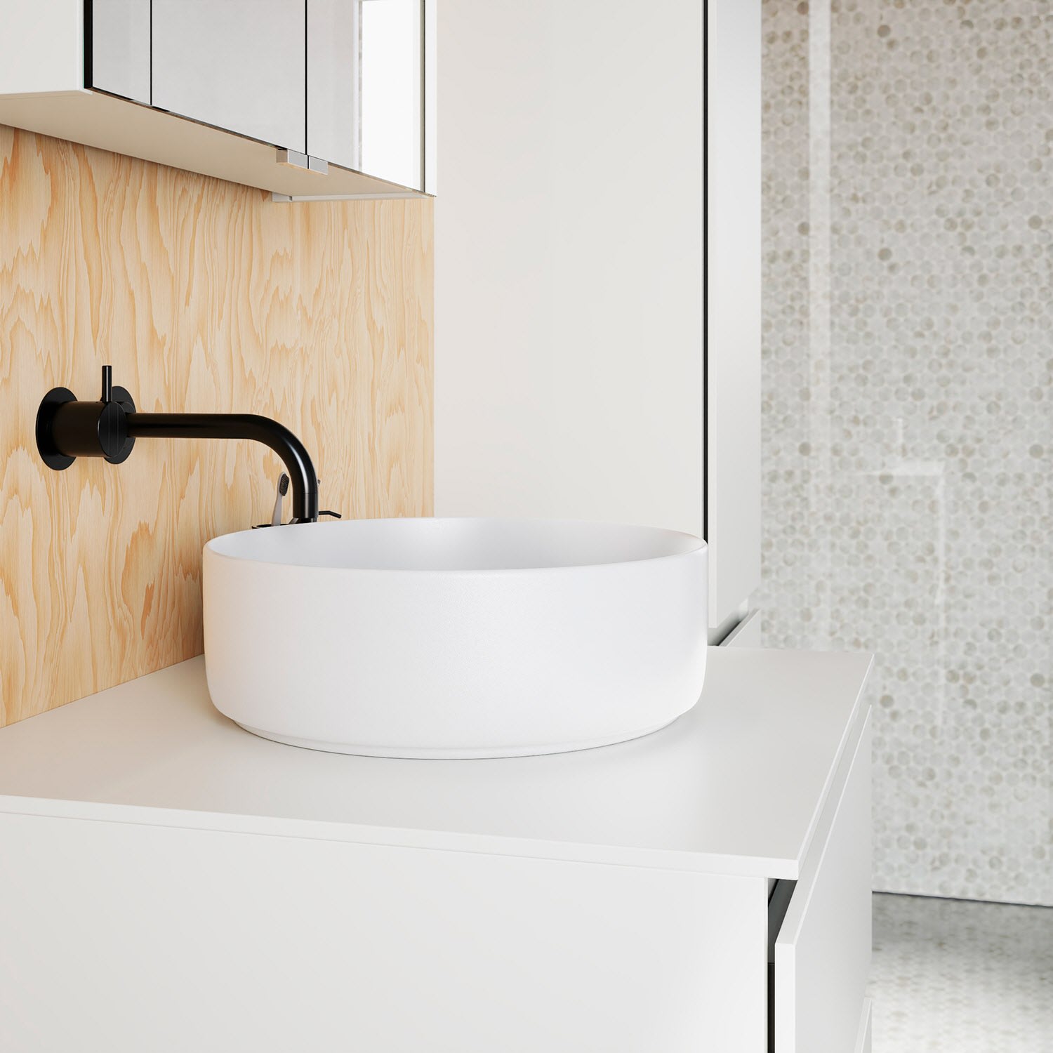 Die Waschtischplatte wird ohne Armaturbohrung geliefert. Armaturbohrungen müssen bauseits vorgenommen werden.