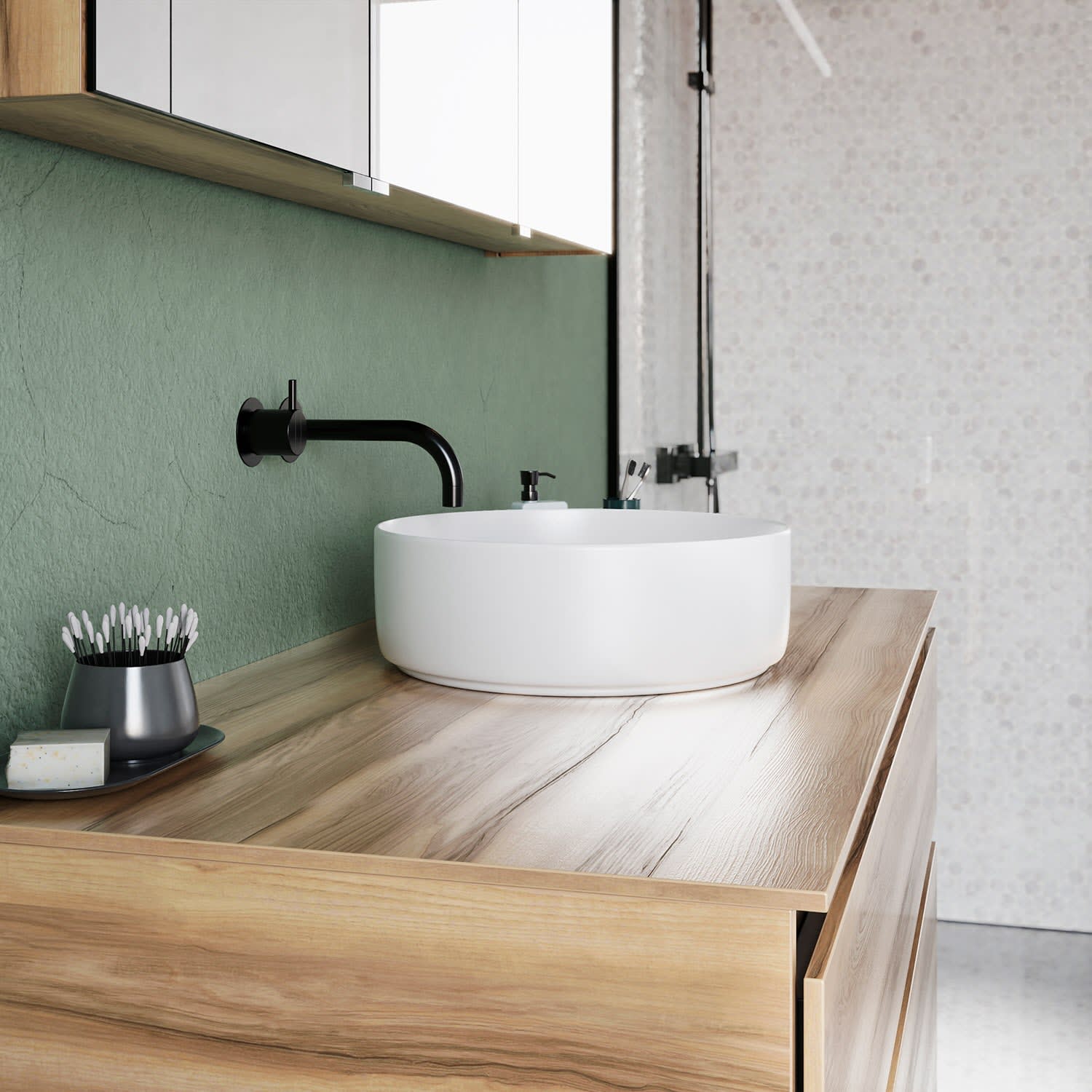 Die Waschtischplatte wird ohne Armaturbohrung geliefert. Armaturbohrungen müssen bauseits vorgenommen werden.