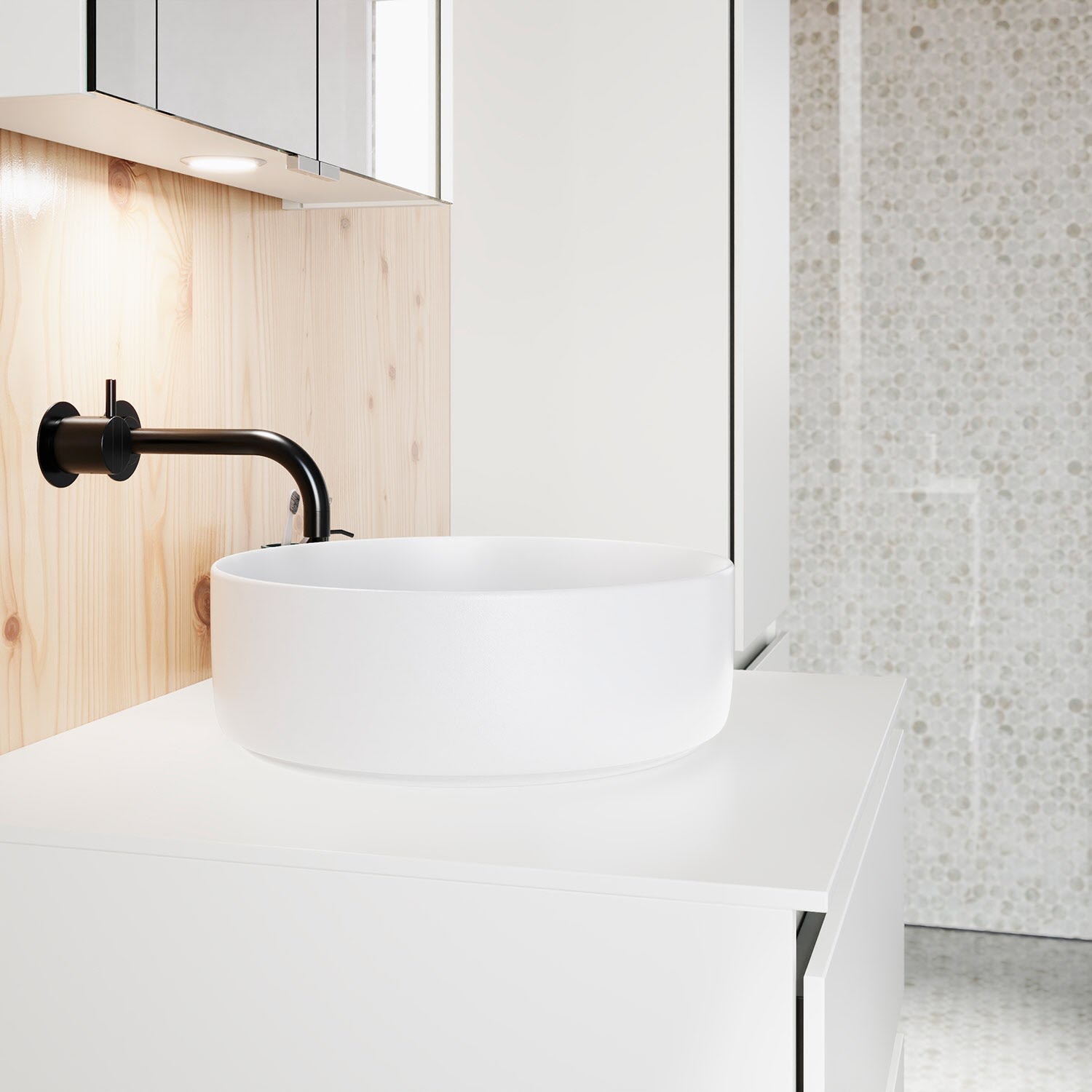 Die Waschtischplatte wird ohne Armaturbohrung geliefert. Armaturbohrungen müssen bauseits vorgenommen werden.
