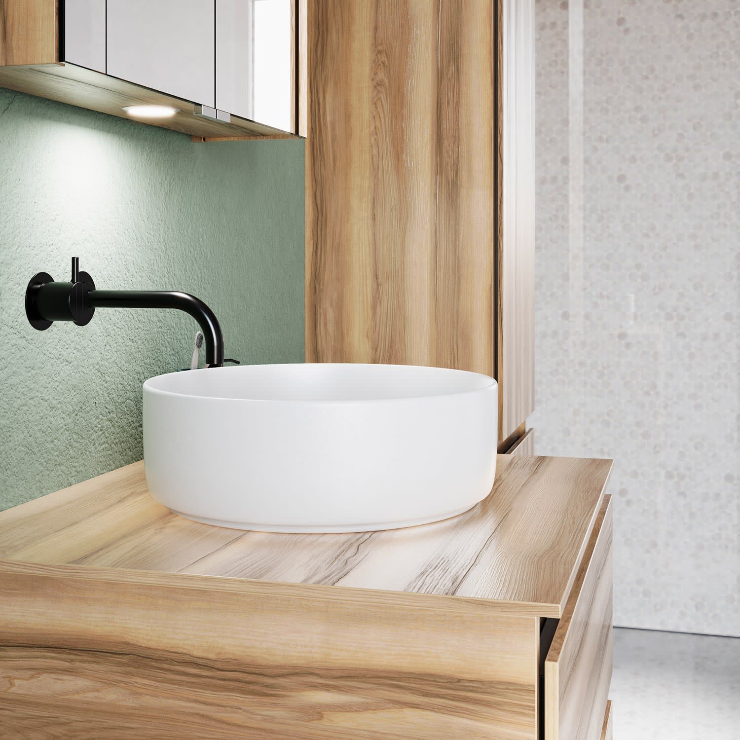 Die Waschtischplatte wird ohne Armaturbohrung geliefert. Armaturbohrungen müssen bauseits vorgenommen werden.