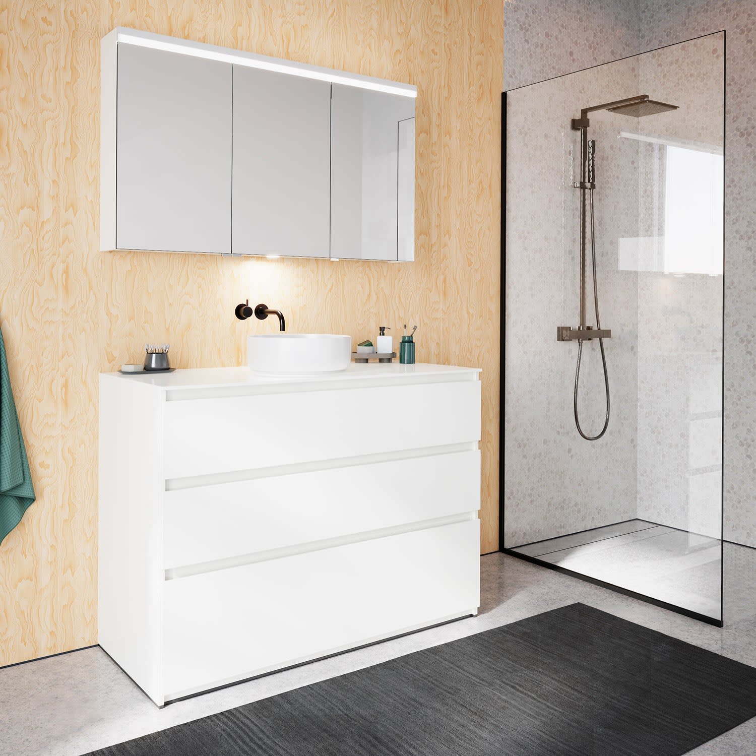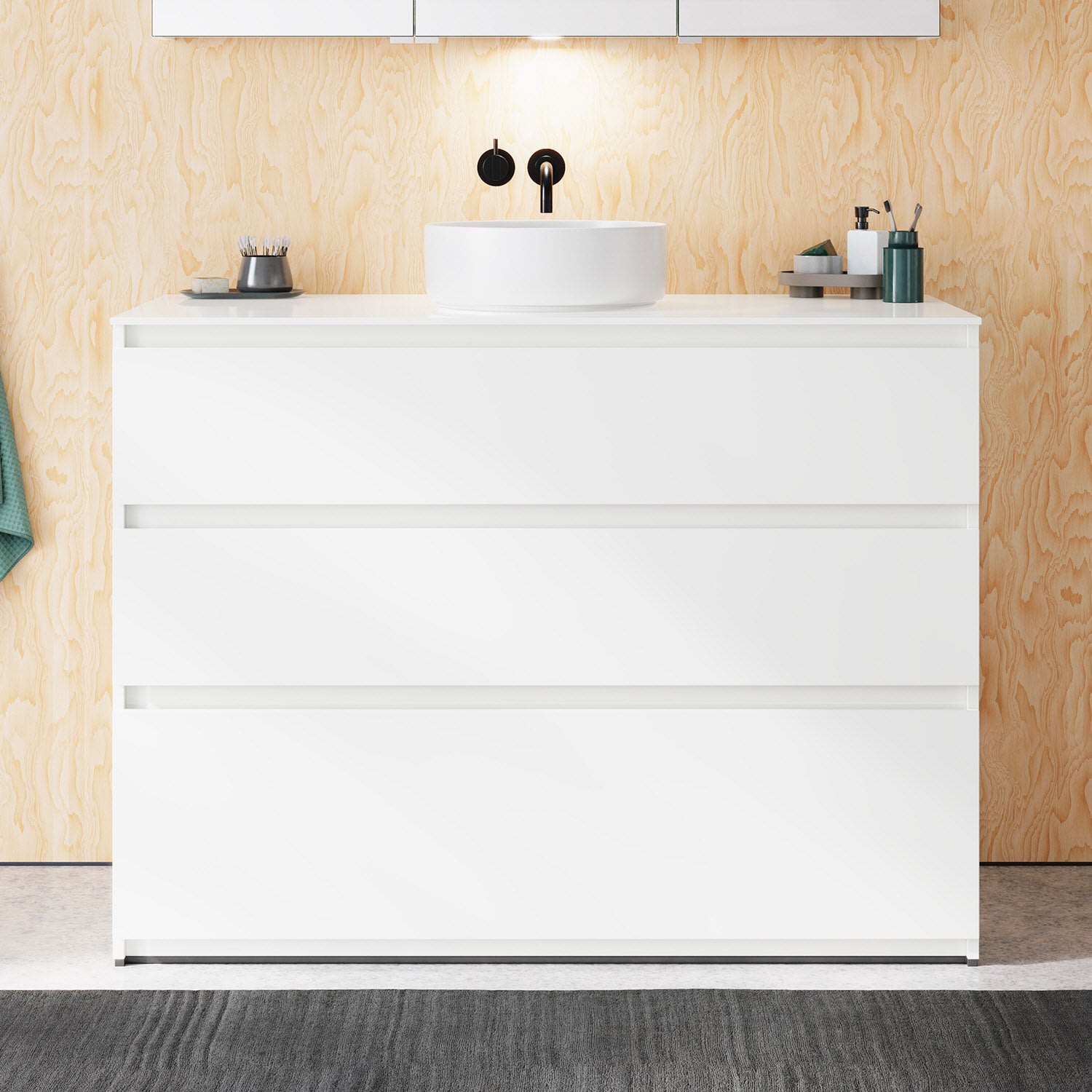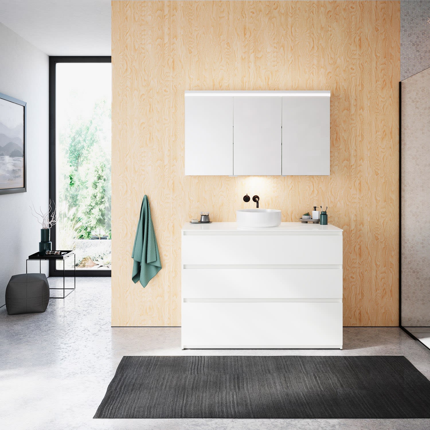 burgbad Lin20 Waschtischunterschrank mit Konsolenplatte 120 cm, 3 Auszüge, Beckenausschnitt mittig