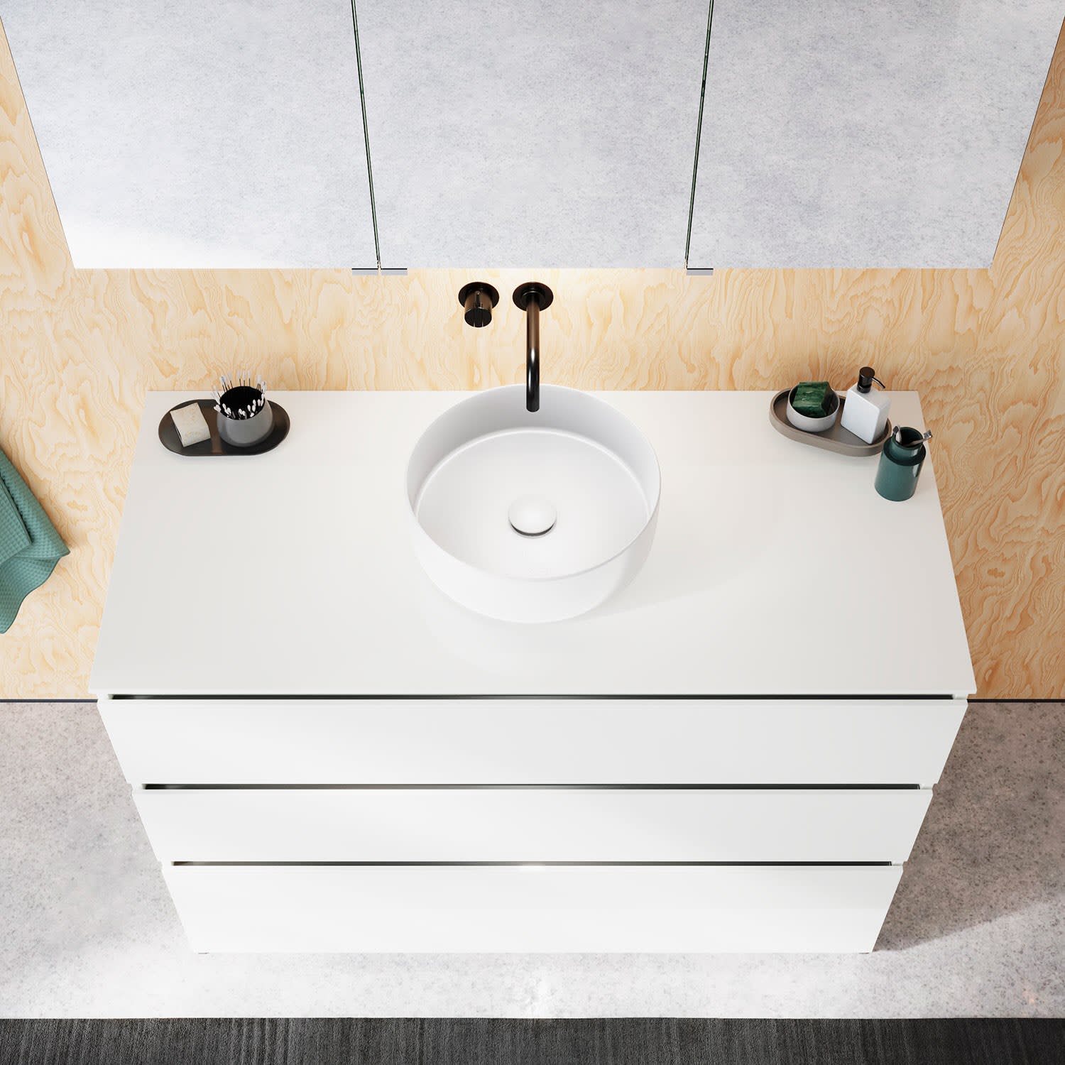 Die Waschtischplatte wird ohne Armaturbohrung geliefert. Armaturbohrungen müssen bauseits vorgenommen werden.