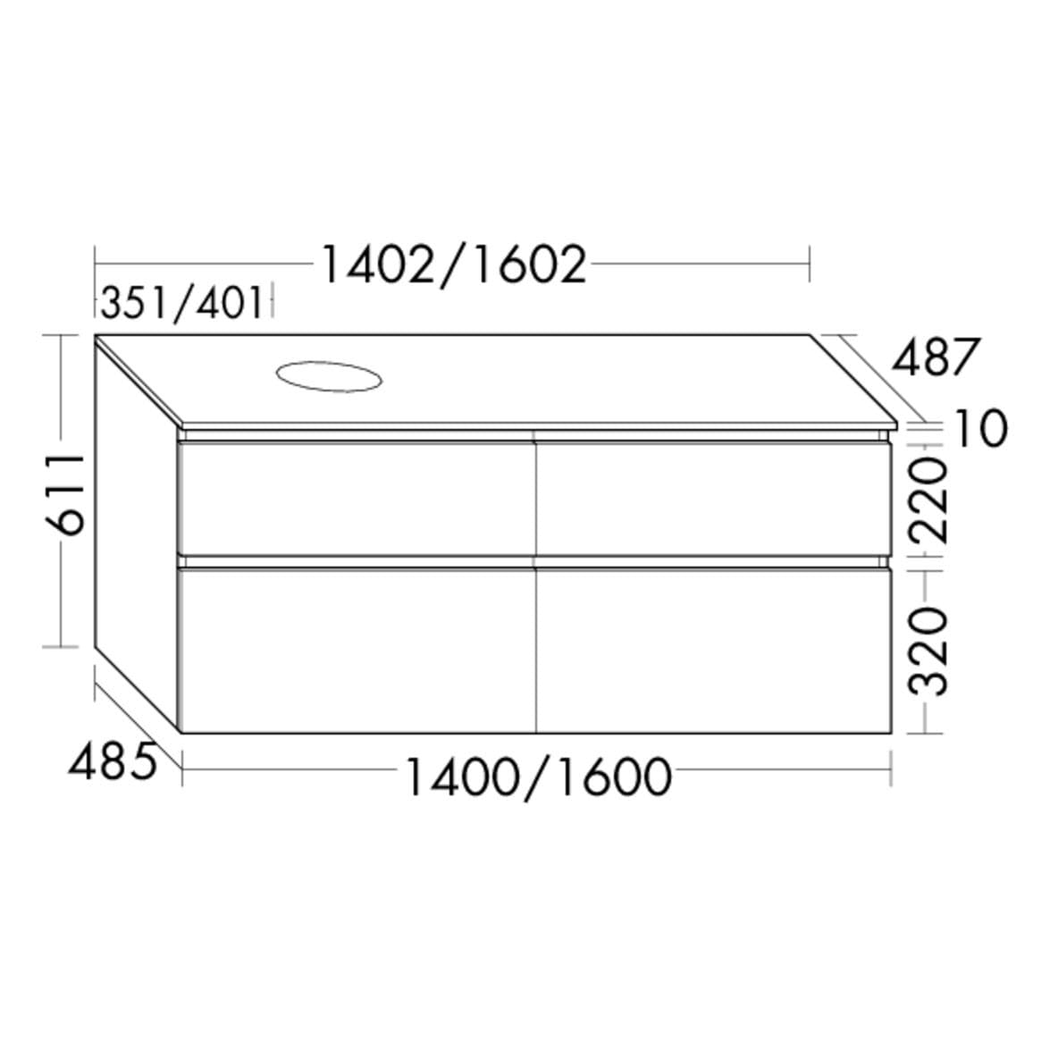 - Position Beckenausschnitt in der Tiefe: mittig bei Becken ohne Wandbefestigung oder wandbündig bei Becken mit Wandbefestigung (Bitte bei Bestellung den gewünschten Waschtisch mit angebeben.)