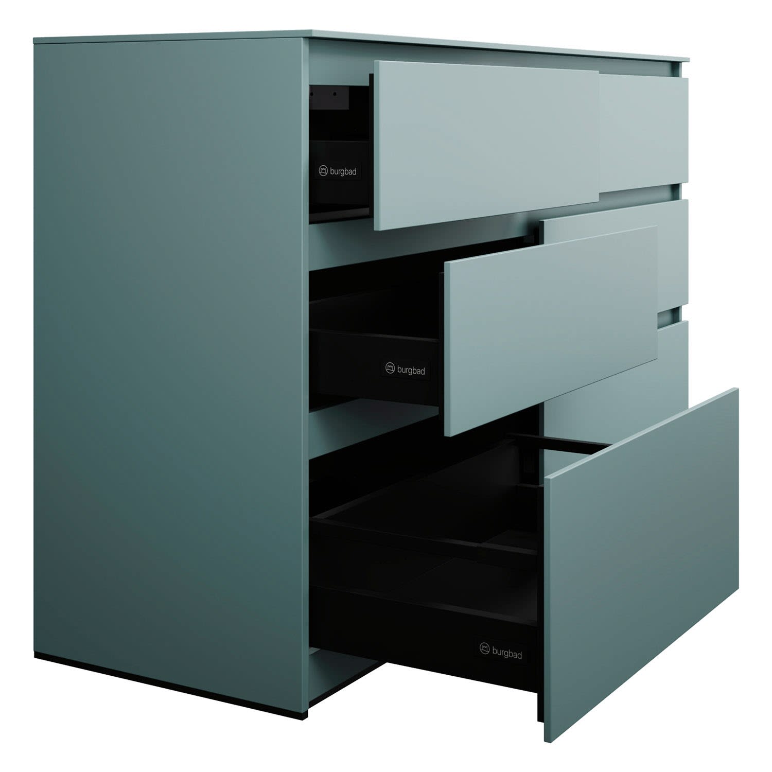 - Vollauszug mit geräuscharmem Selbsteinzugsmechanismus inklusive Anschlagdämpfung (Silent System)