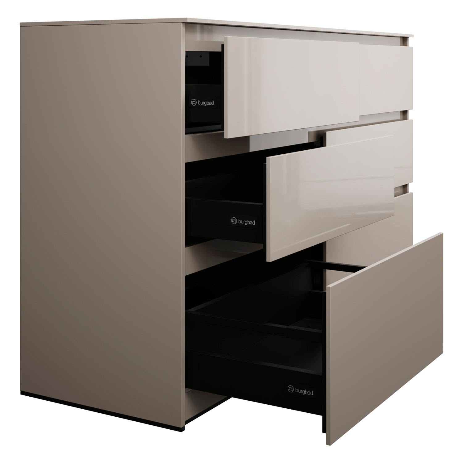 - Vollauszug mit geräuscharmem Selbsteinzugsmechanismus inklusive Anschlagdämpfung (Silent System)