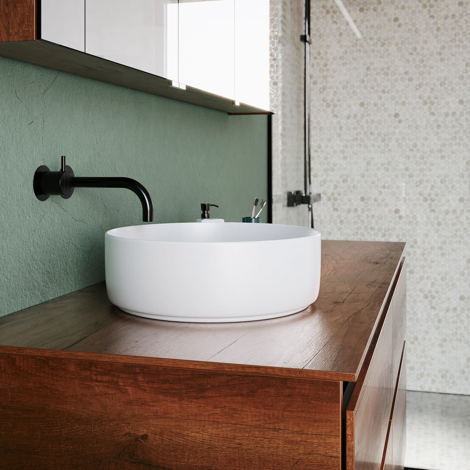 Die Waschtischplatte wird ohne Armaturbohrung geliefert. Armaturbohrungen müssen bauseits vorgenommen werden.