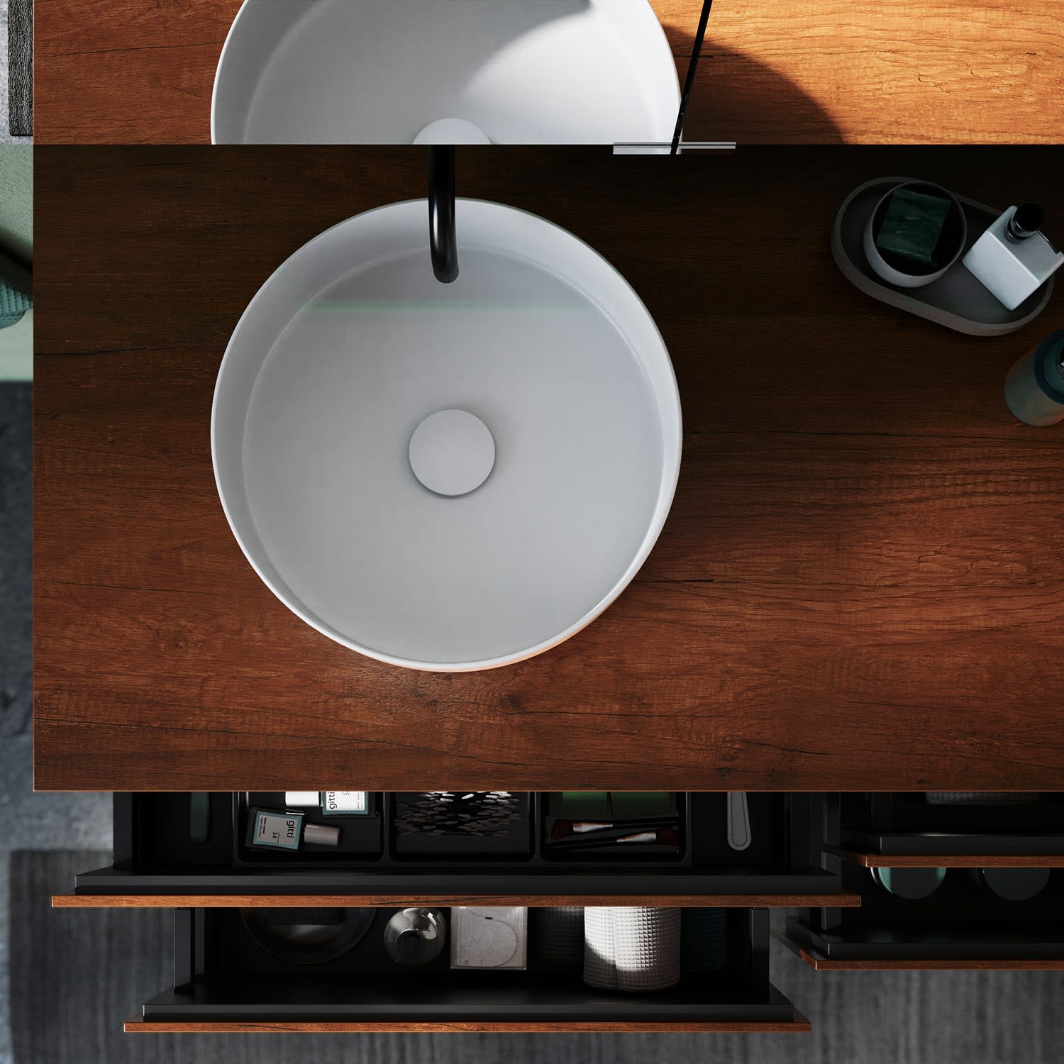 - 2 Auszüge oben H: 22 T: 35 cm, 1x mit Siphonausschnitt und Inneneinteilung