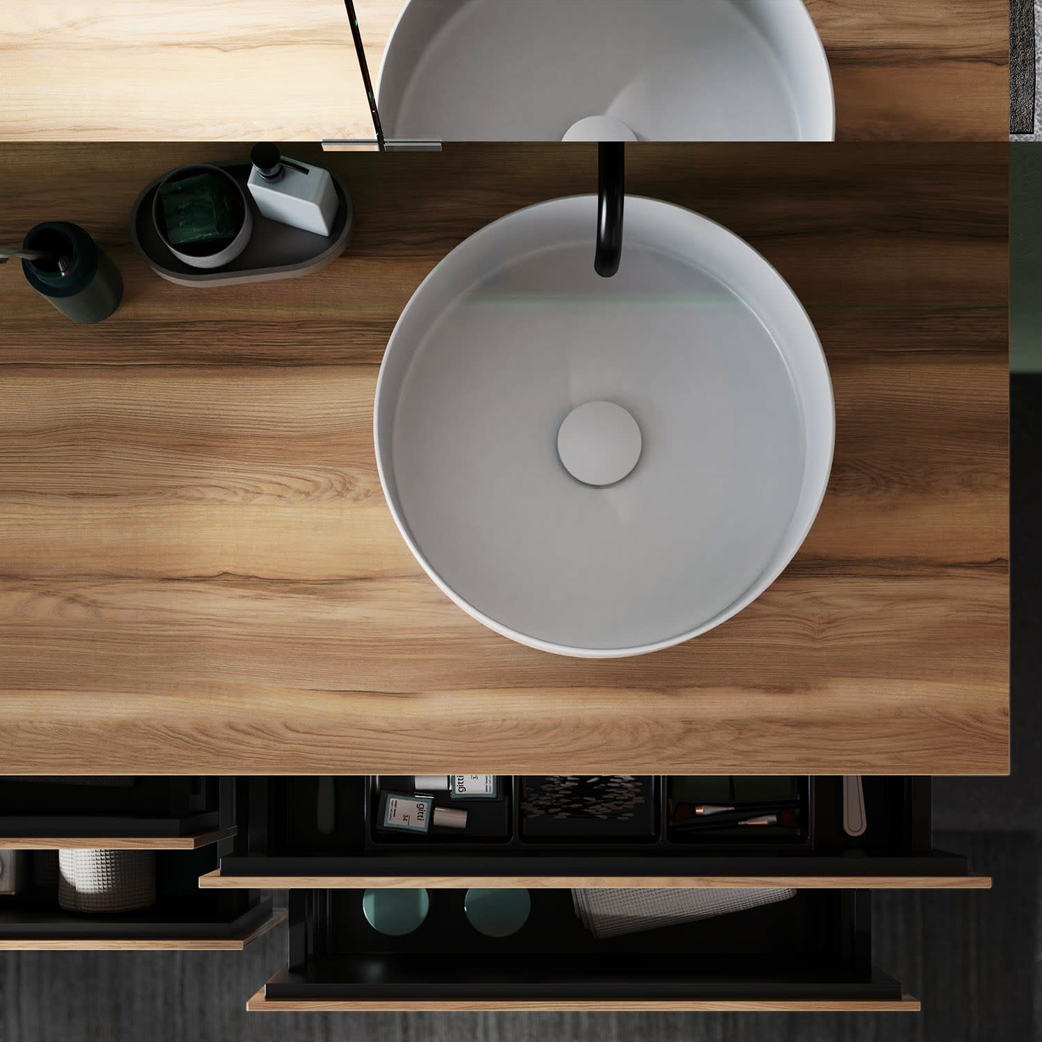 - 2 Auszüge oben H: 22 T: 35 cm, 1x mit Siphonausschnitt und Inneneinteilung