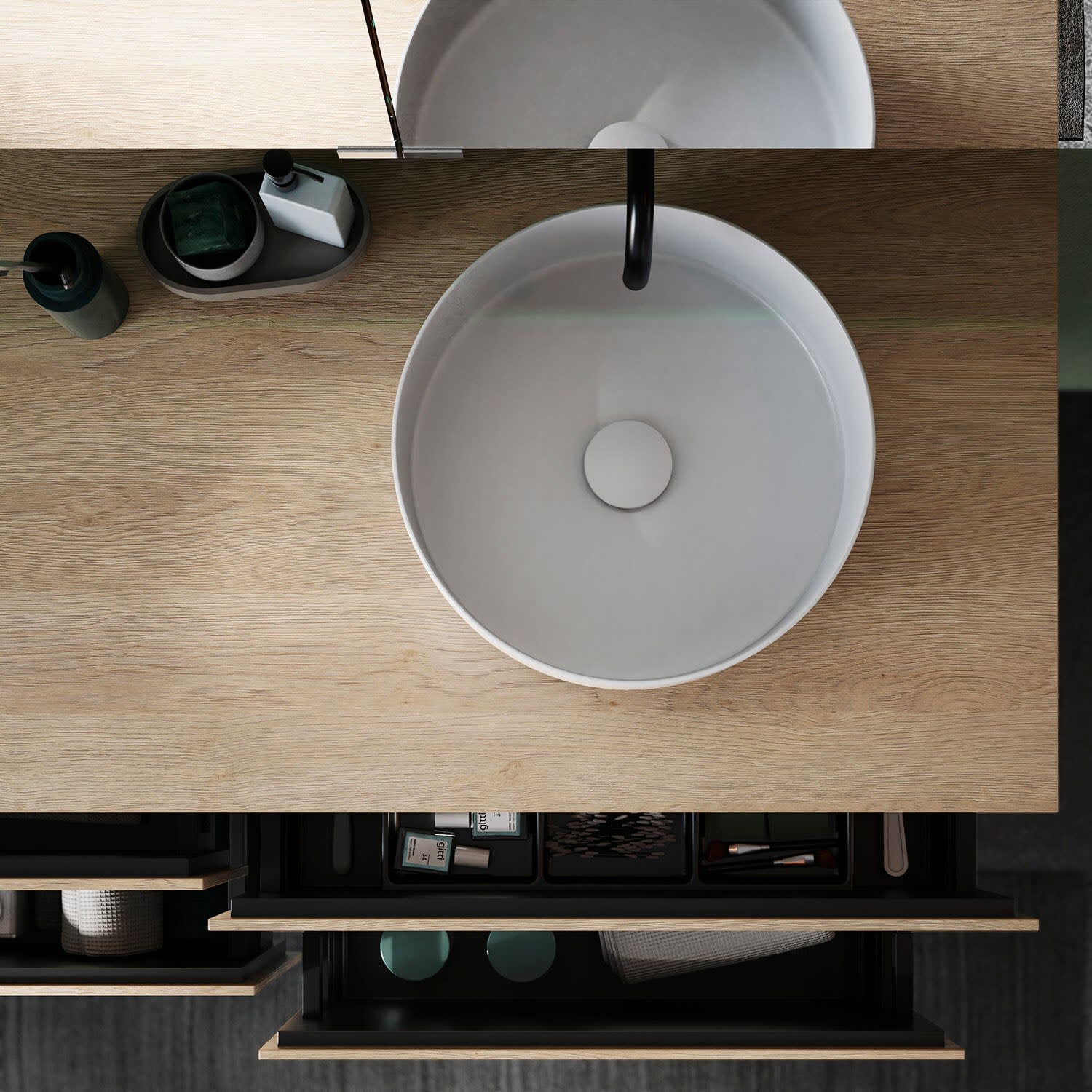 - 2 Auszüge oben H: 22 T: 35 cm, 1x mit Siphonausschnitt und Inneneinteilung