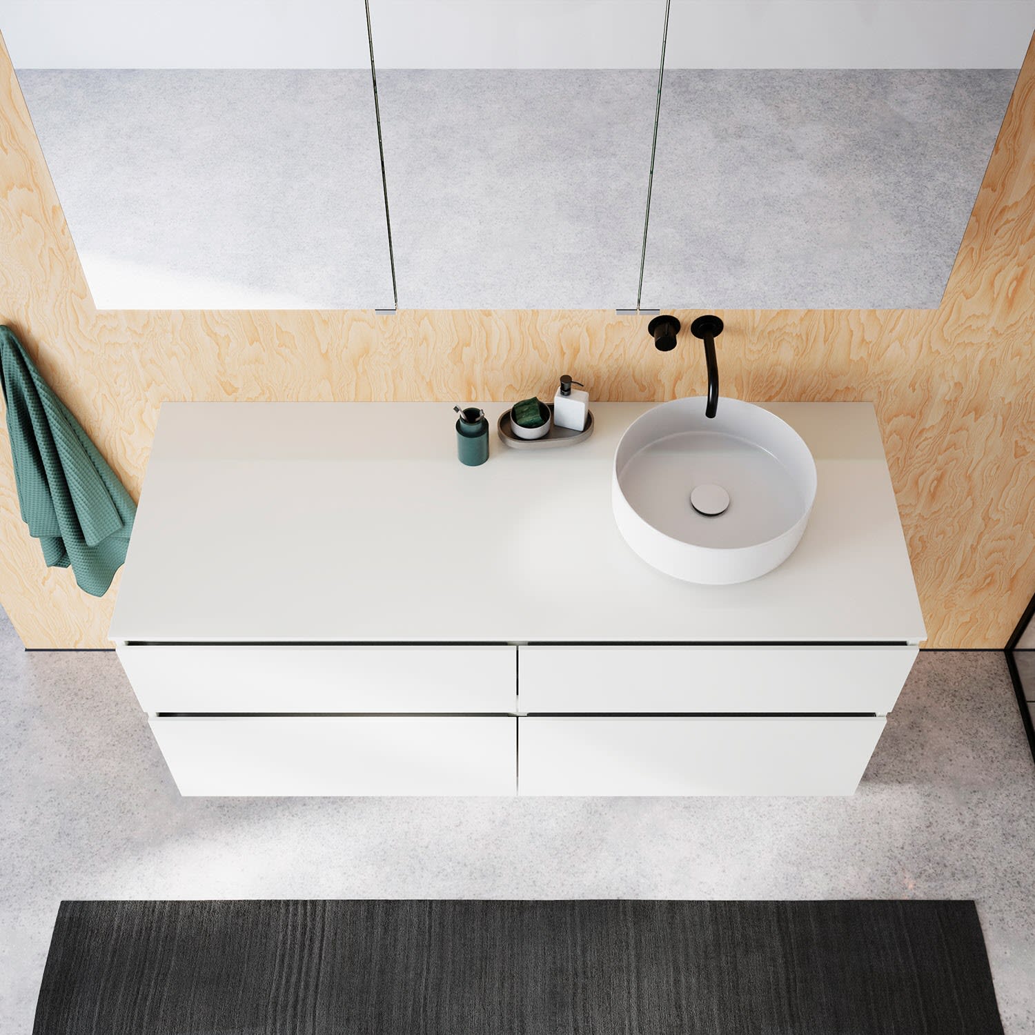 burgbad Lin20 Waschtischunterschrank mit Konsolenplatte 140 cm, 4 Auszüge, Beckenausschnitt rechts
