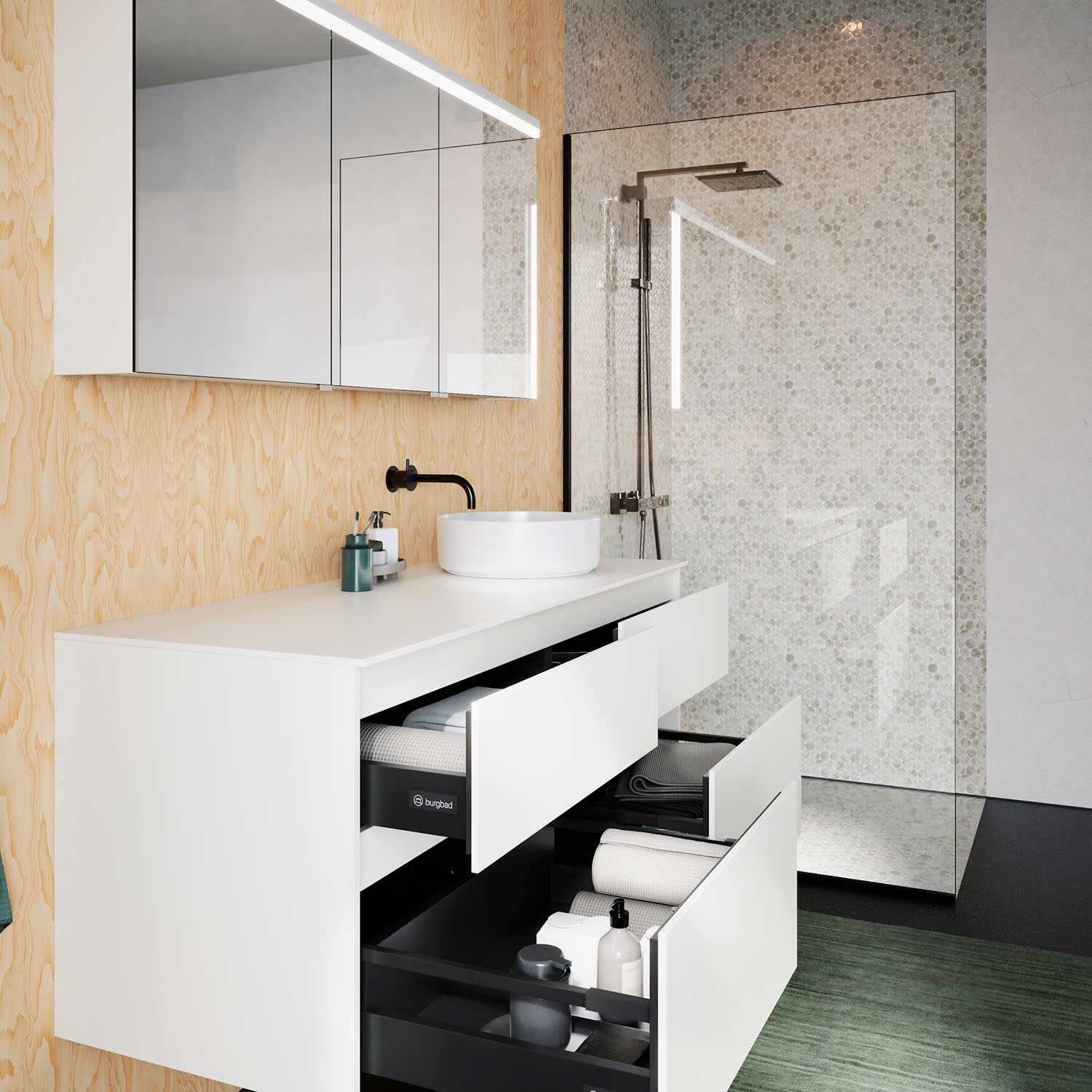 burgbad Lin20 Waschtischunterschrank mit Konsolenplatte 140 cm, 4 Auszüge, Beckenausschnitt rechts