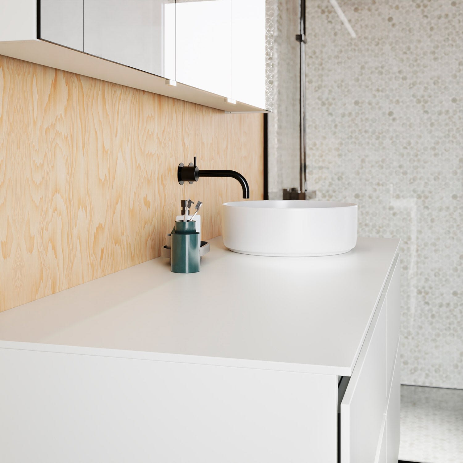 Die Waschtischplatte wird ohne Armaturbohrung geliefert. Armaturbohrungen müssen bauseits vorgenommen werden.