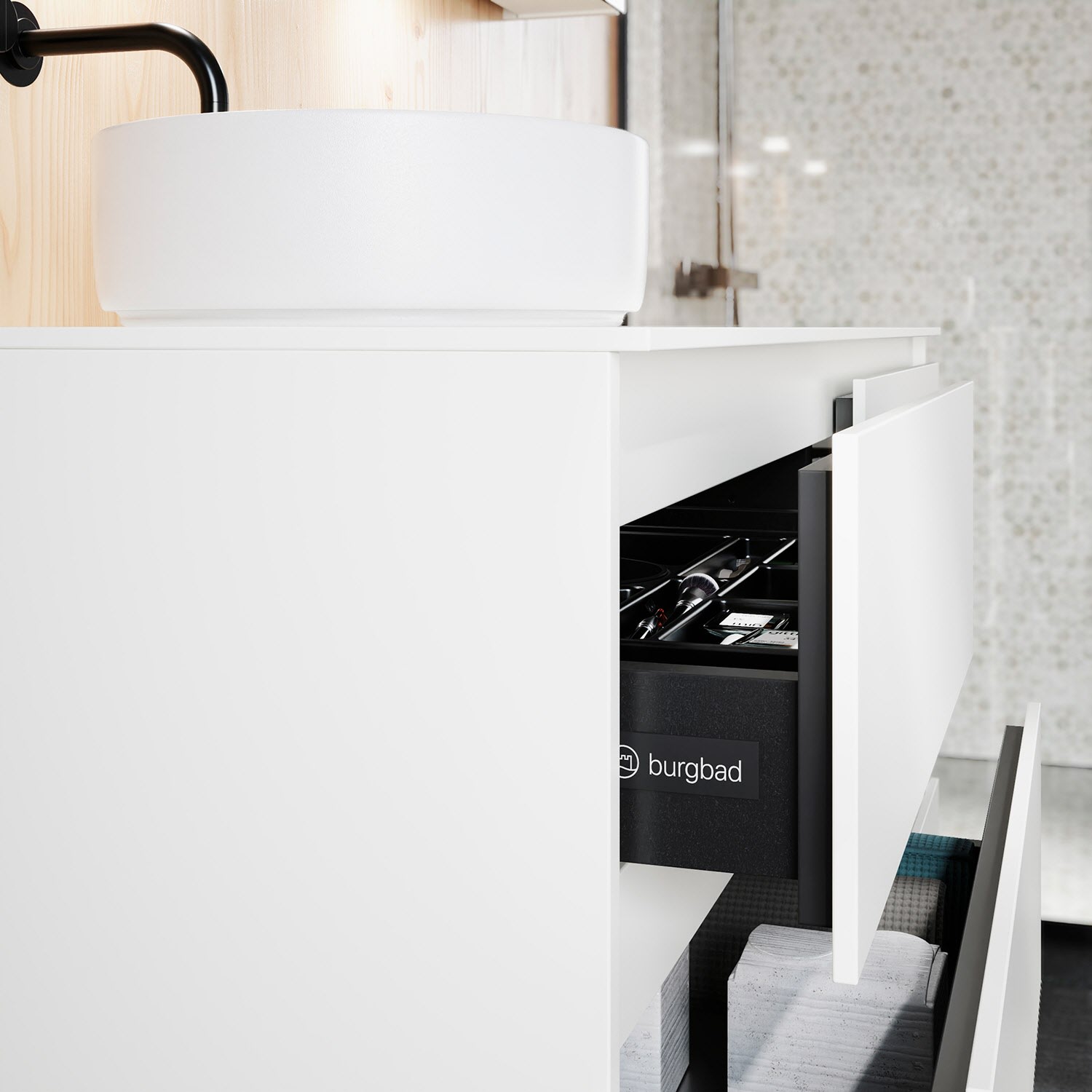 burgbad Lin20 Waschtischunterschrank mit Konsolenplatte 140 cm, 6 Auszüge, Beckenausschnitt links