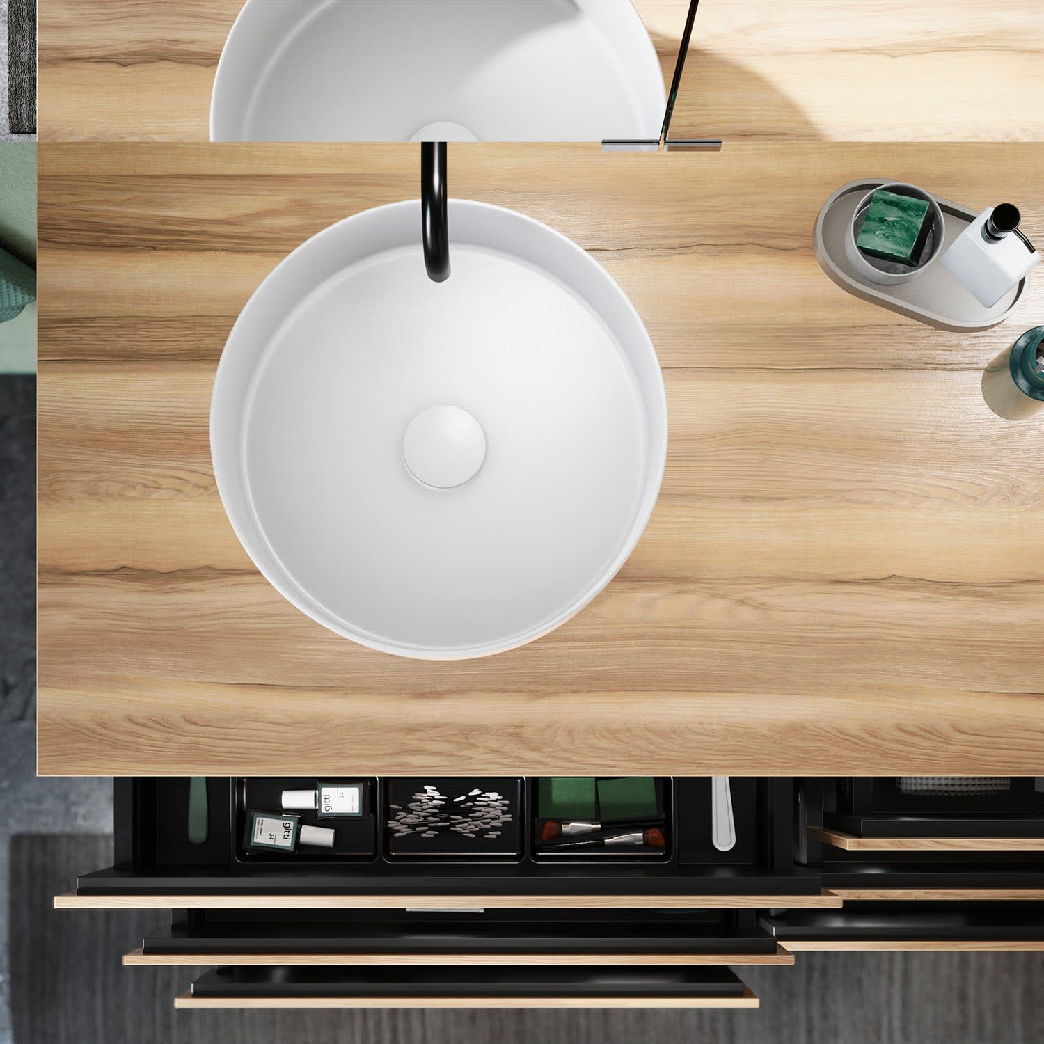 - 2 Auszüge oben H: 22 T: 35 cm, 1x mit Siphonausschnitt und Inneneinteilung