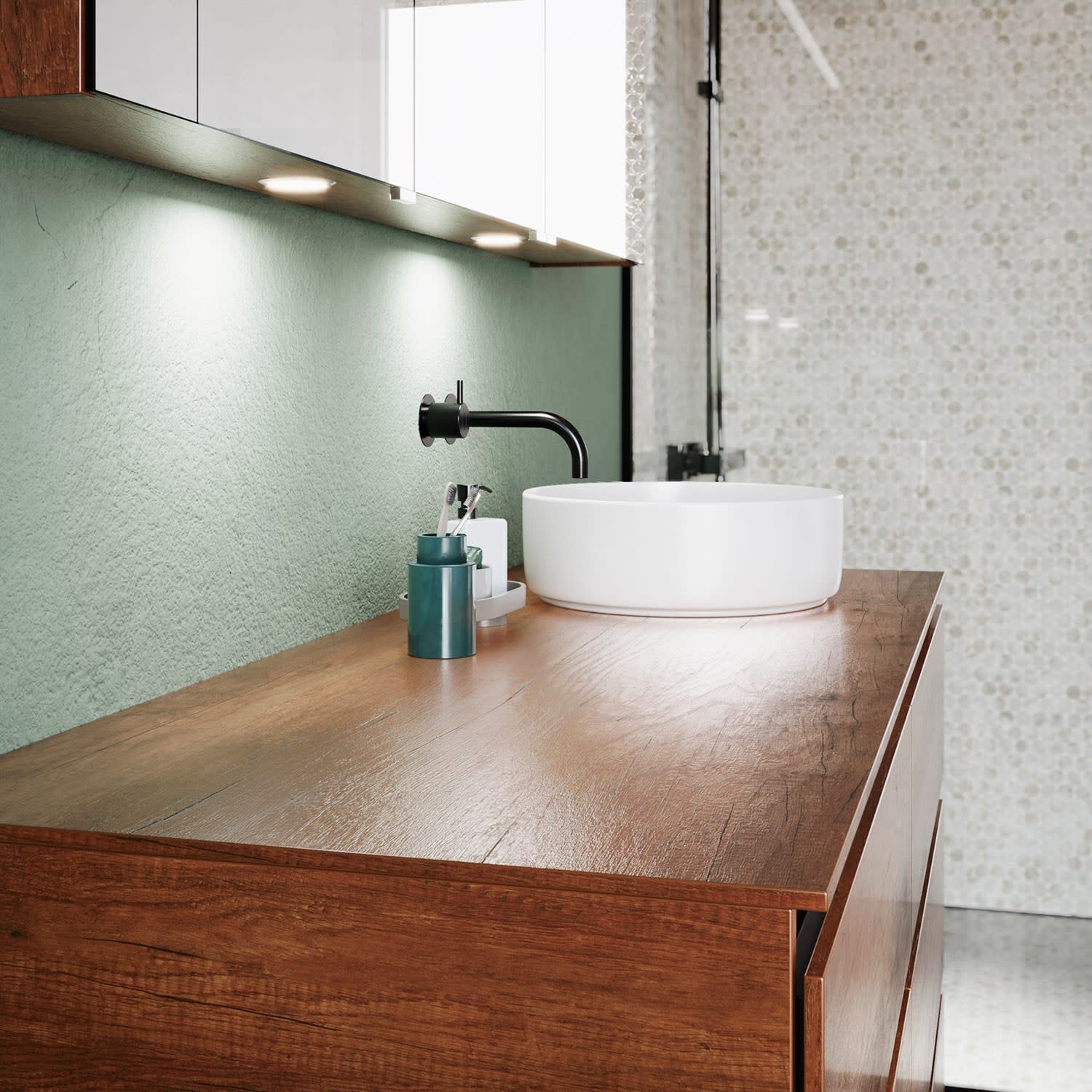 Die Waschtischplatte wird ohne Armaturbohrung geliefert. Armaturbohrungen müssen bauseits vorgenommen werden.