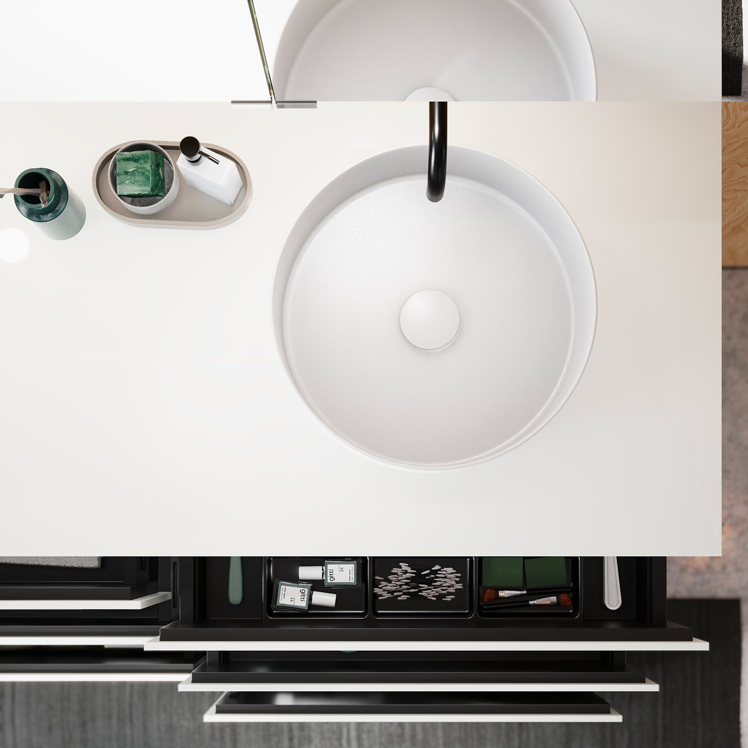- 2 Auszüge oben H: 22 T: 35 cm, 1x mit Siphonausschnitt und Inneneinteilung