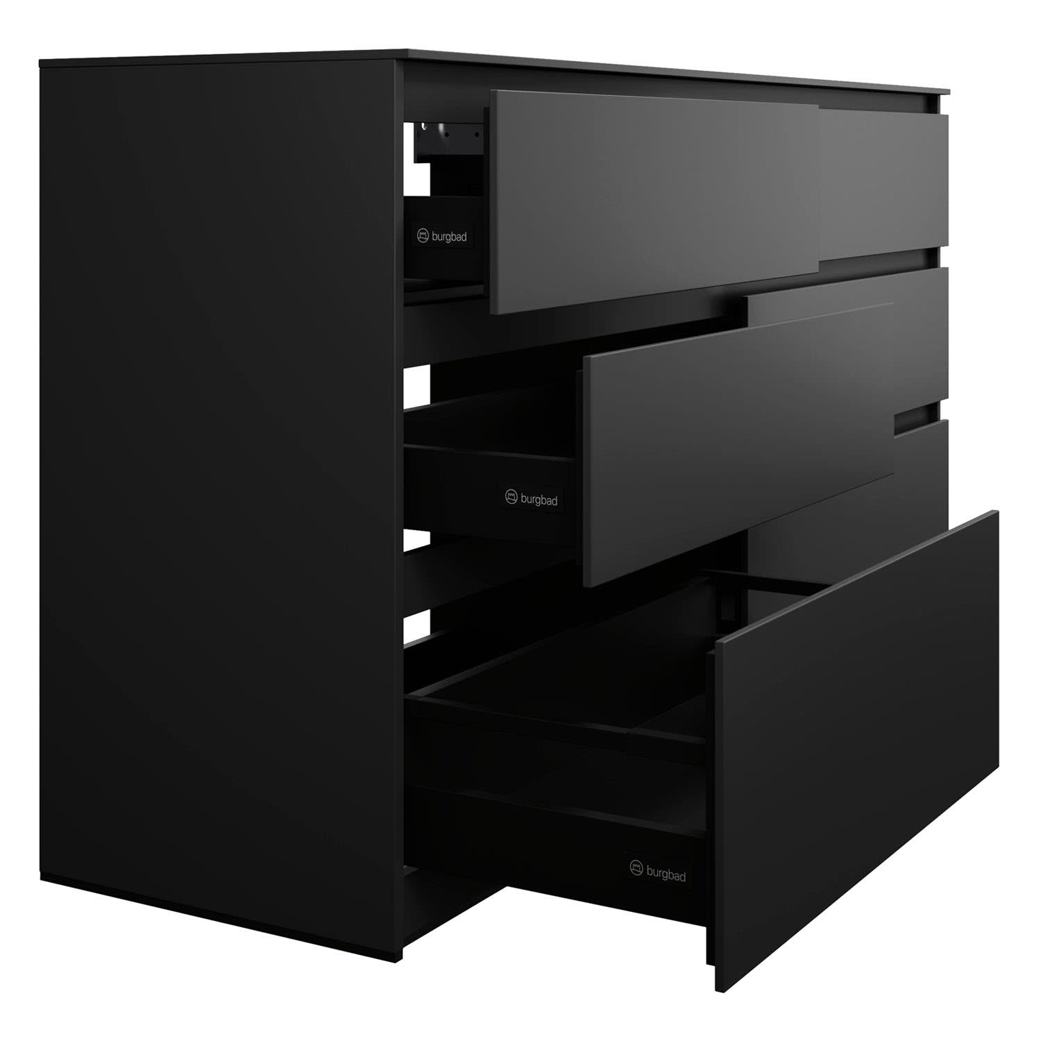 - Vollauszug mit geräuscharmem Selbsteinzugsmechanismus inklusive Anschlagdämpfung (Silent System)