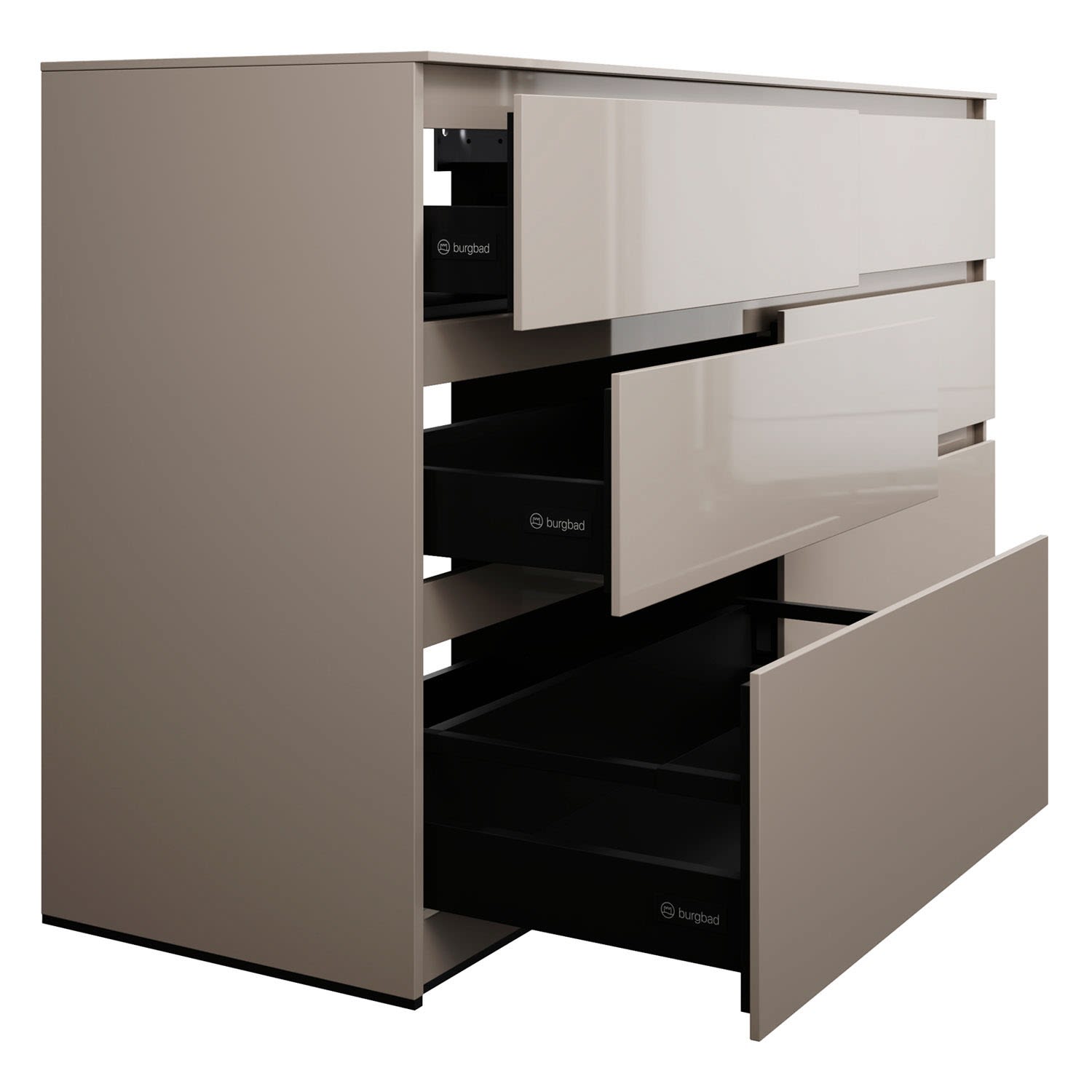 - Vollauszug mit geräuscharmem Selbsteinzugsmechanismus inklusive Anschlagdämpfung (Silent System)